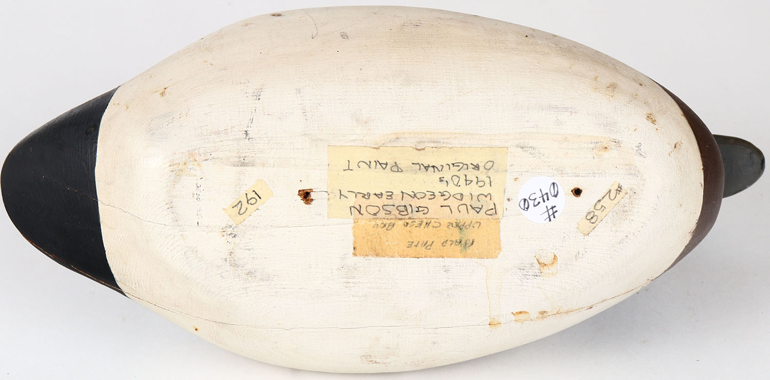 Widgeon by Paul Gibson, Havre de Grace, MD, painted eyes, structurally excellent, solid wood, original paint. Grade: MINT - Value: 100 to 200