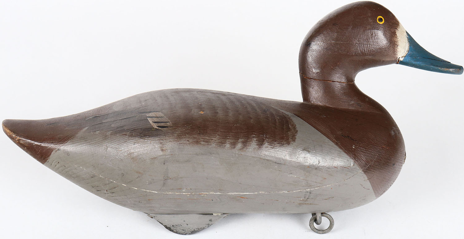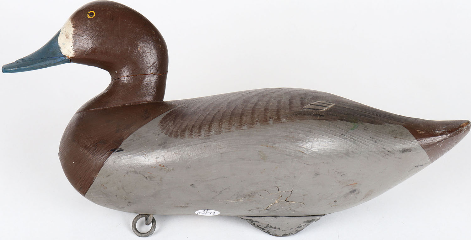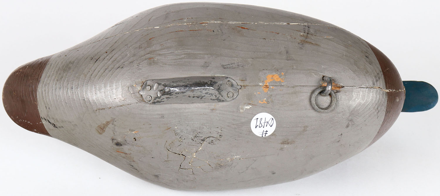 Bluebill Hen by unknown maker, (style of Madison Mitchel), Havre de Grace, MD, painted eyes, neck and bill is cracked, has age cracks on bottom, solid wood, original paint. Grade: Very Good ++ - Value: 70 to 300