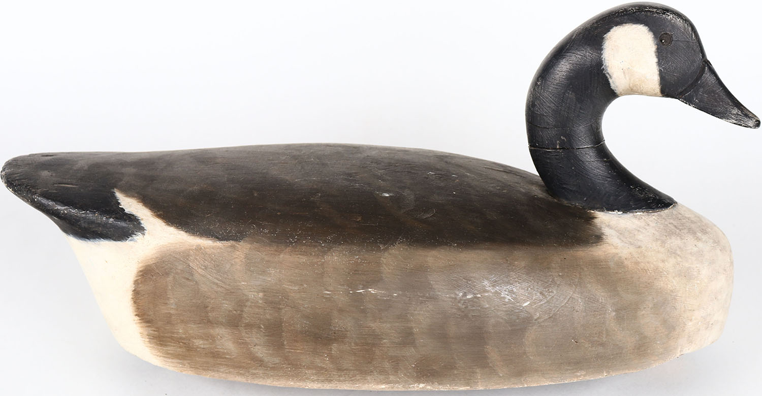 Canada Goose by Wildfowler Decoys Inc. Old Saybrook CT, glass eyes, head is cracked, solid wood, branded by WILDFOWLER DECOYS on bottom, original paint. Grade: Very Good ++ - Value: 100 to 200