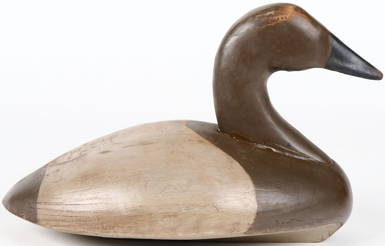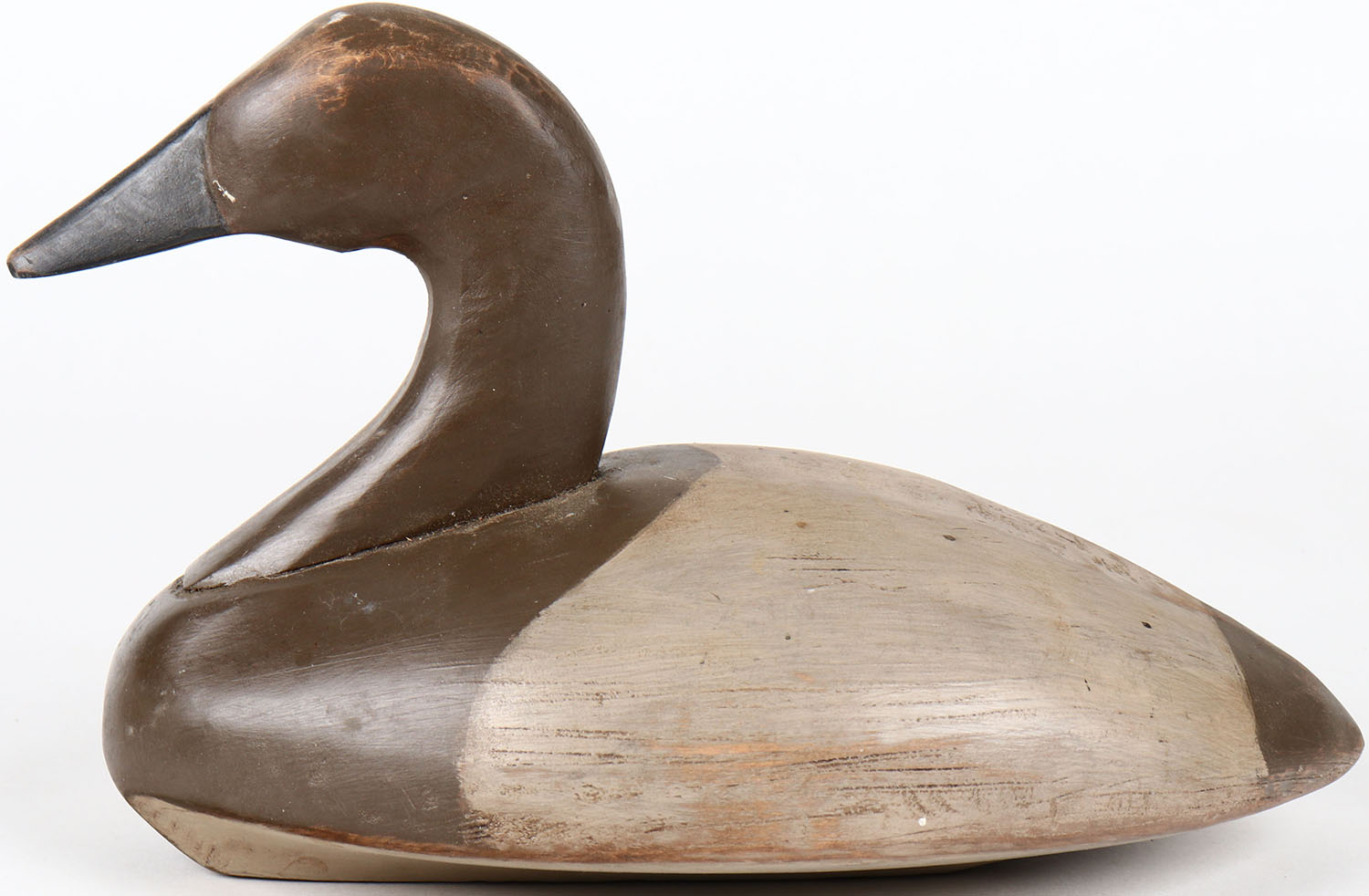 Canvasback Hen by Dennis Finden , no eyes, structurally excellent, solid wood, signed on bottom, original paint. Grade: Excellent ++ - Value: 50 to 100
