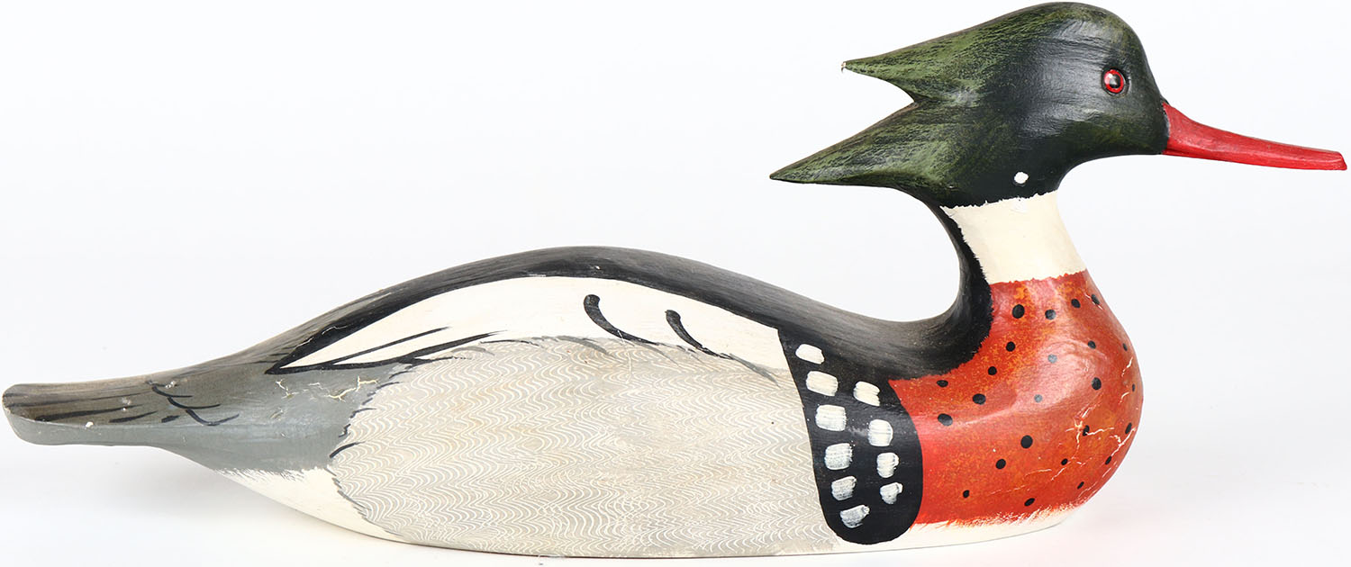 Red Breasted Merganser by John A. Nelson, glass eyes, structurally excellent, solid wood, signed on bottom, original paint with comb painting. Grade: MINT - Value: 30 to 60