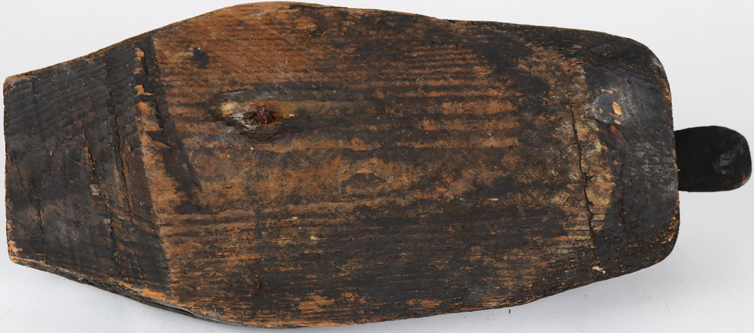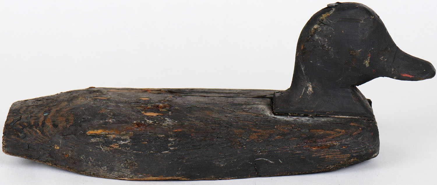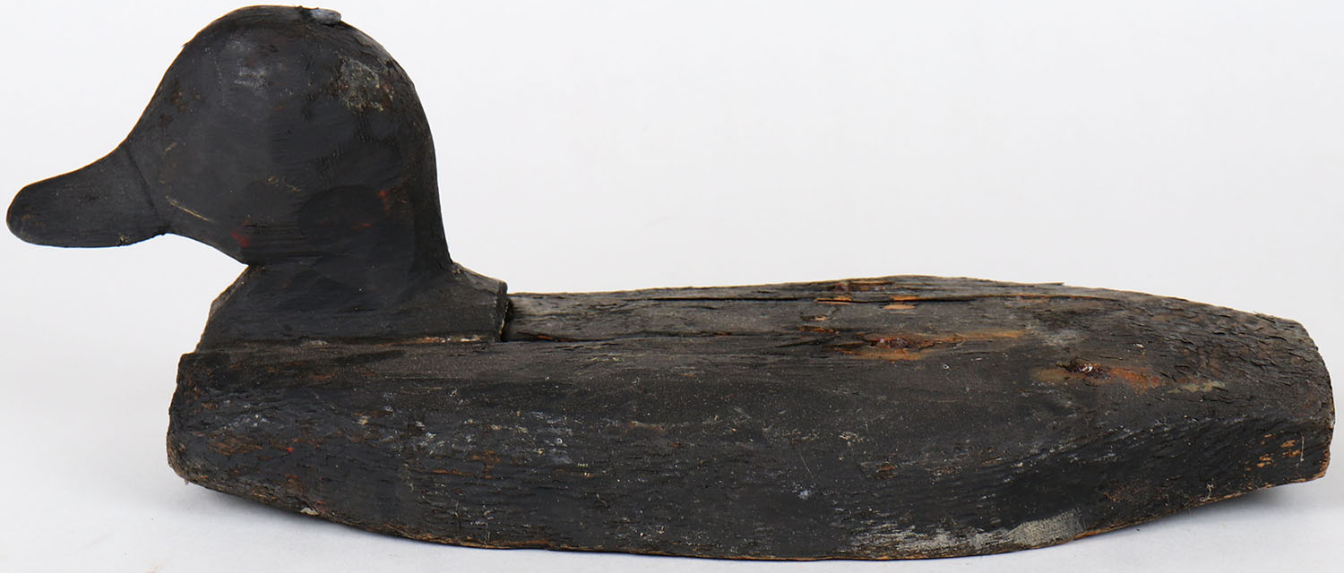 Bluebill Drake by unknown maker, no eyes, has age cracks on back, solid wood, original paint. Grade: Very Good + - Value: 20 to 40