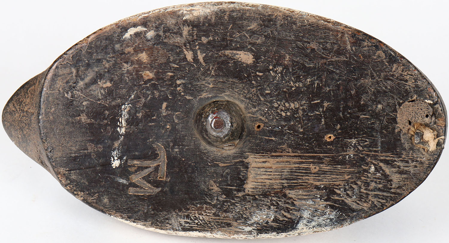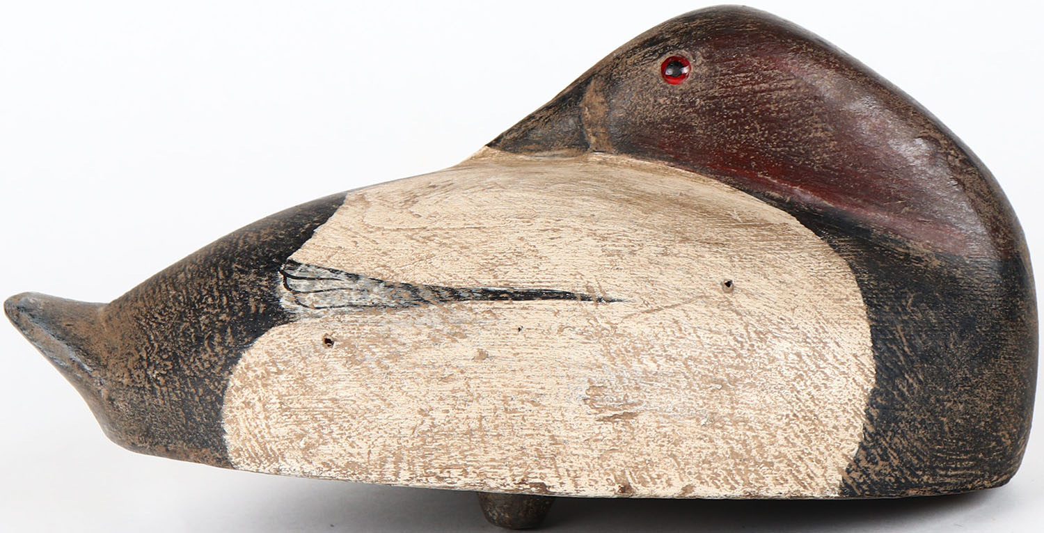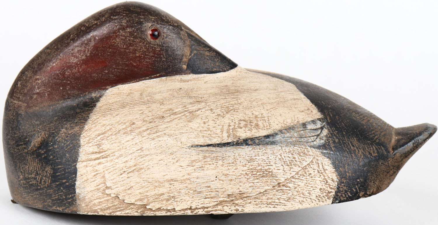 Sleeping Canvasback Drake by Tom Martindale, Ontario, CAN, glass eyes, structurally excellent, solid wood, branded TM on bottom, original paint. Grade: MINT - Value: 100 to 200