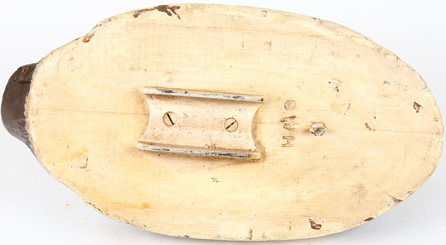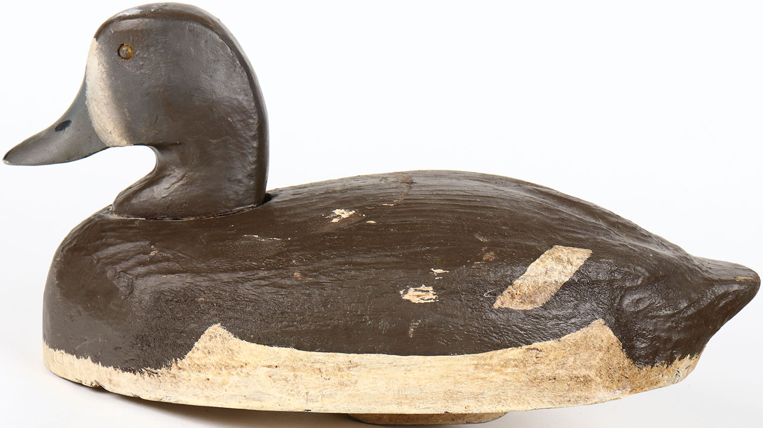 Bluebill Hen by Herters, glass eyes, structurally excellent, solid balsa wood, branded WH, original paint. Grade: Excellent - Value: 40 to 80