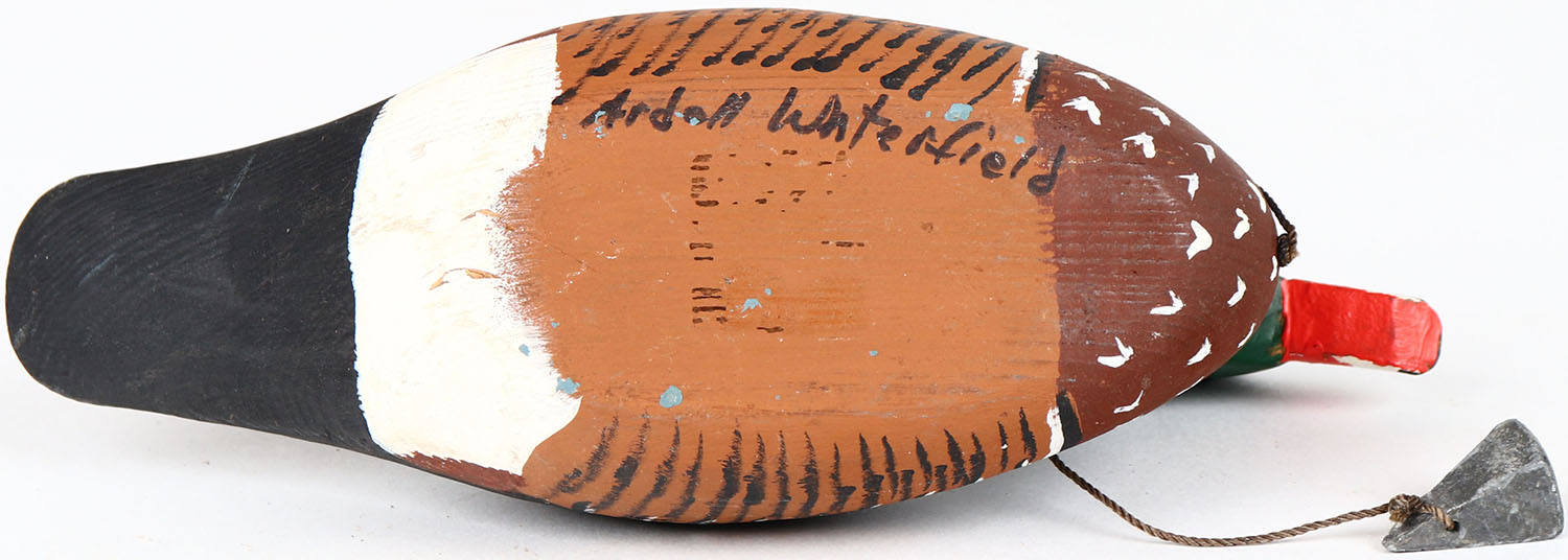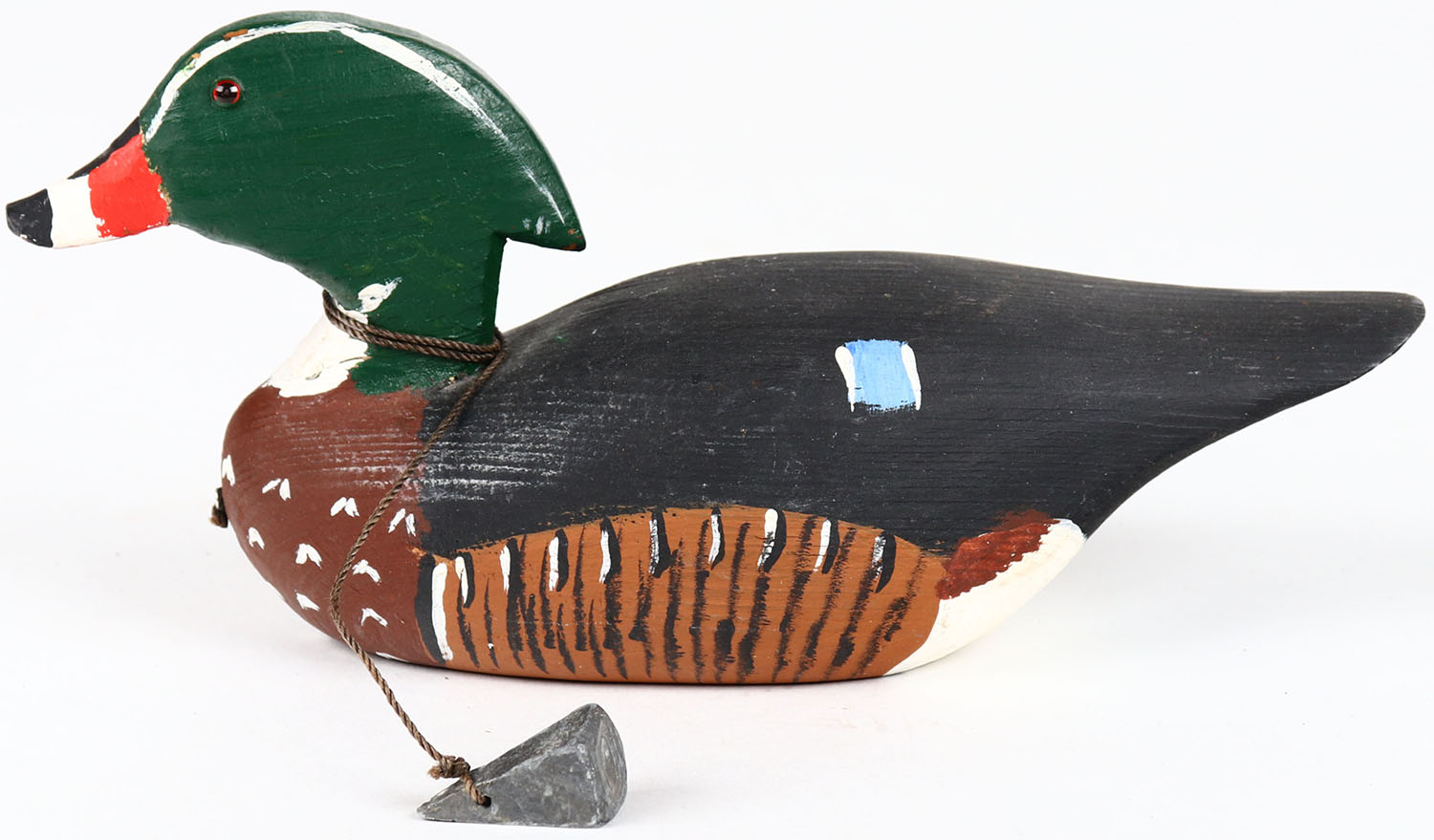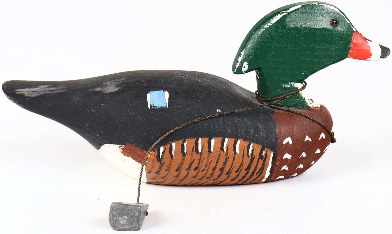 Wood Duck Drake with lead weight by Ardall Waterfield, VA, glass eyes, structurally excellent, solid wood, signed on bottom, original paint. Grade: Excellent ++ - Value: 60 to 150