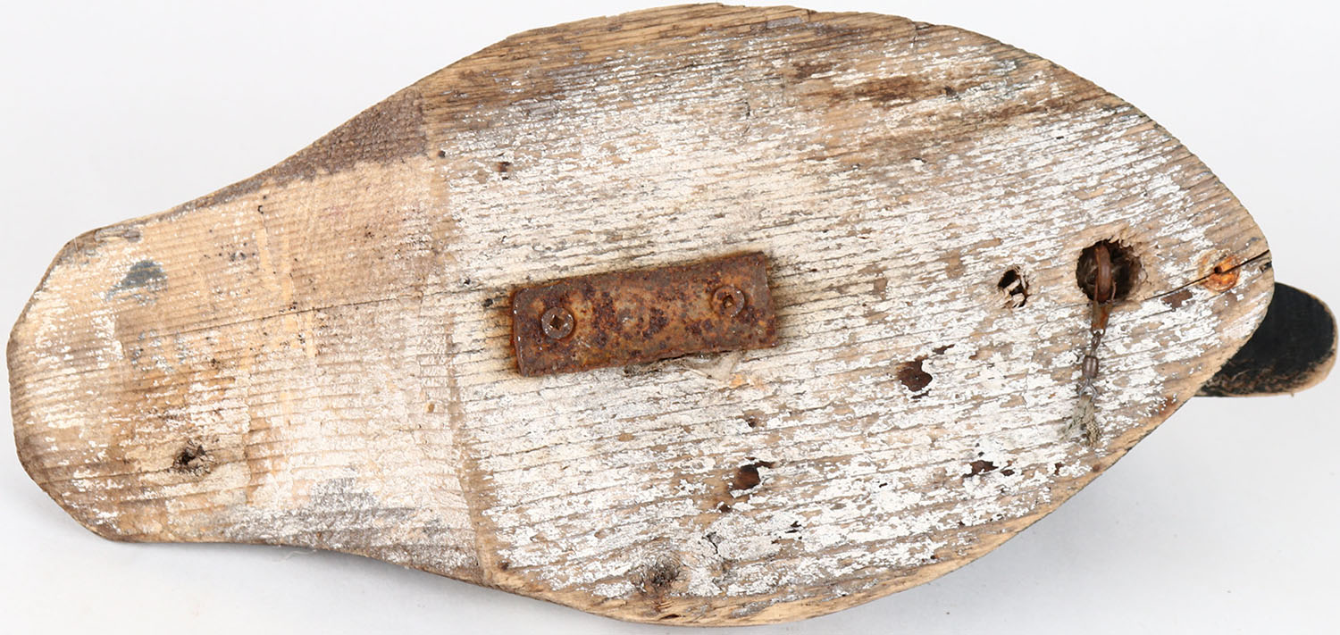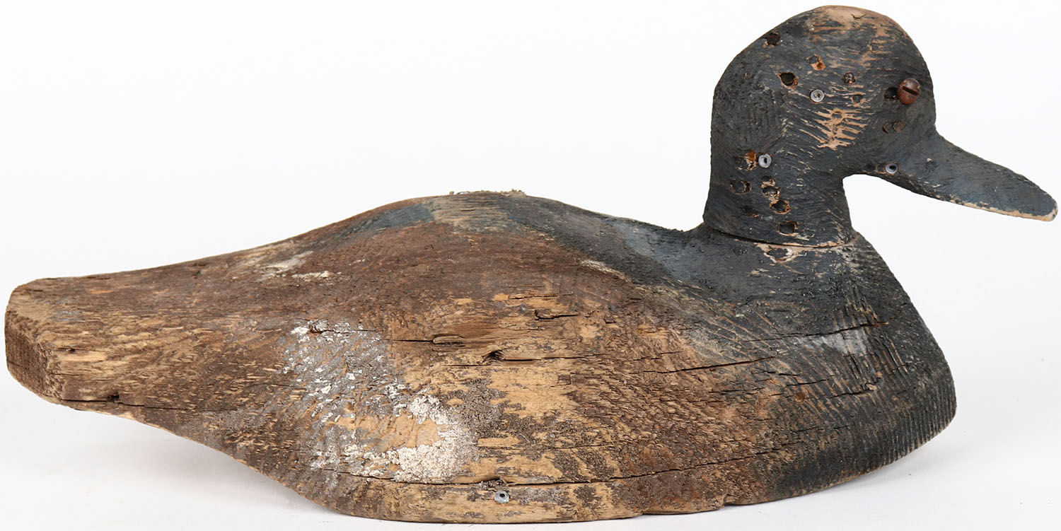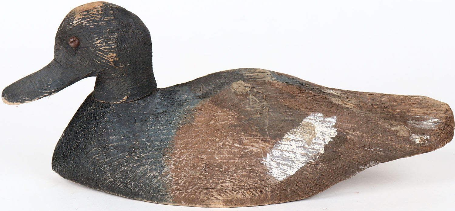 Bluebill Drake by unknown maker, tack eyes, head is loose, has age cracks on body, solid wood, original paint. Grade: Very Good ++ - Value: 30 to 60