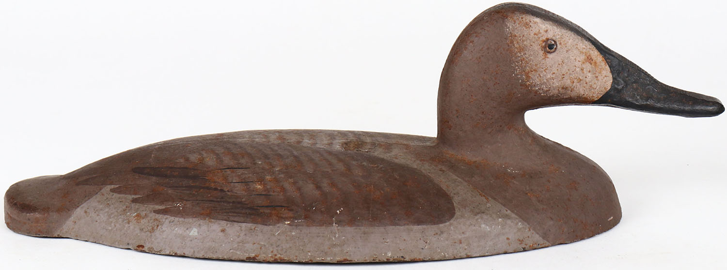 Iron Canvasback Hen repaint attributed to Madison Mitchell, used on SINK BOATS, painted eyes, structurally excellent, cast-iron body, signed on bottom, repainted. Grade: MINT - Value: 50 to 150