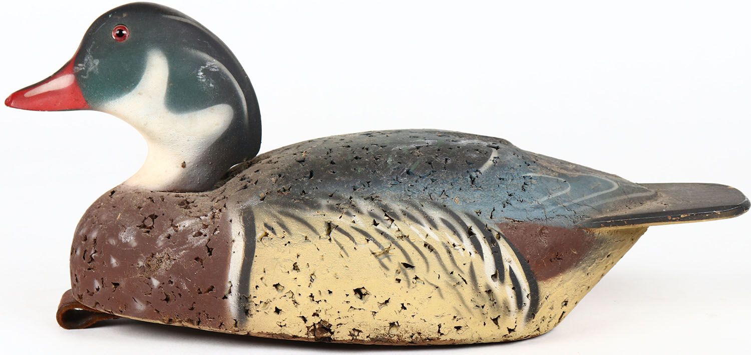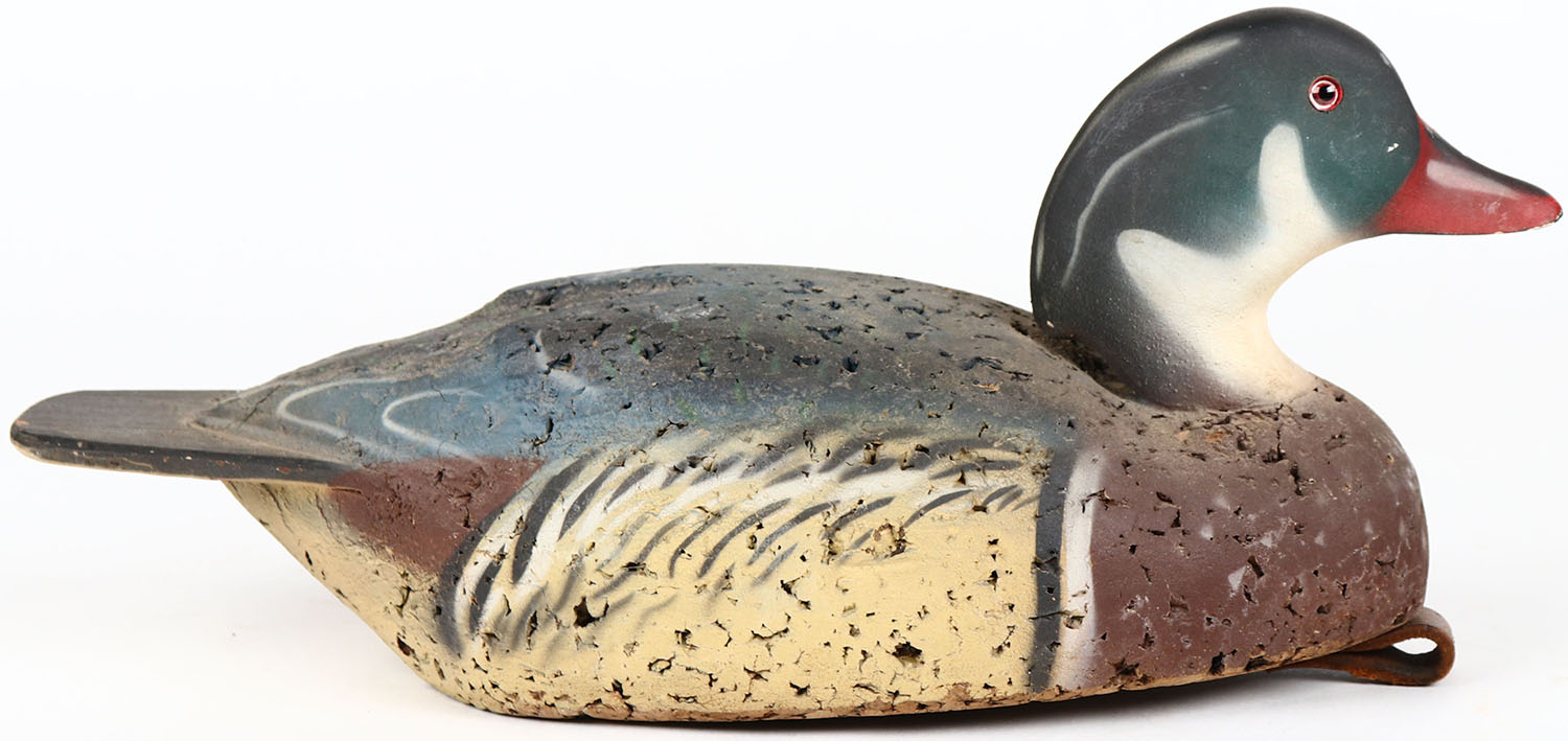 Wood Duck Drake by Herters, glass eyes, structurally excellent, solid cork body, original paint. Grade: Excellent ++ - Value: 100 to 200