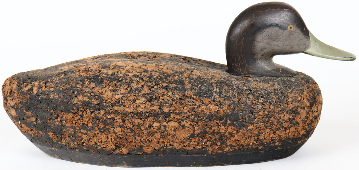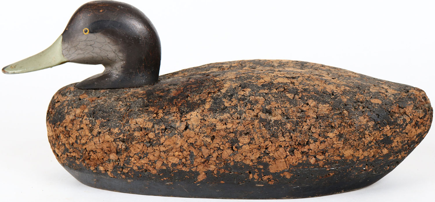 Black Duck by unknown maker, painted eyes, structurally excellent, solid cork body, original paint. Grade: Excellent ++ - Value: 10 to 20