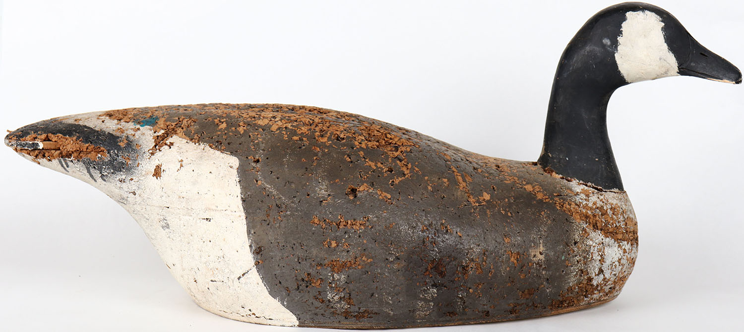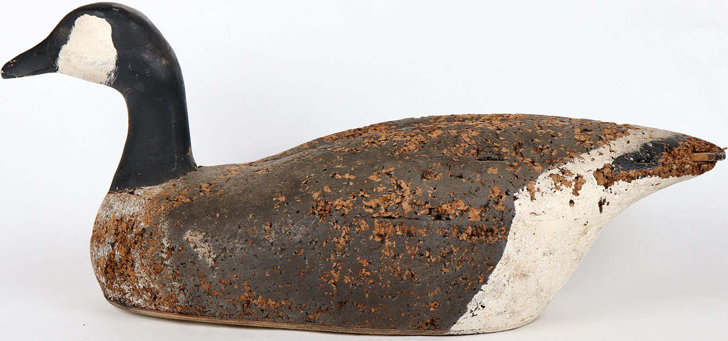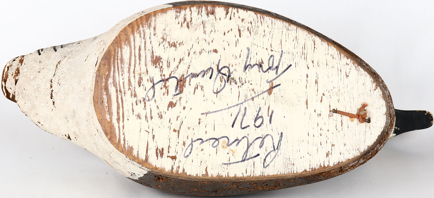 Canada Goose by Tom Q?, (1971) painted eyes, head is loose, tail is chipped, solid cork body, original paint. Grade: Very Good ++ - Value: 50 to 100
