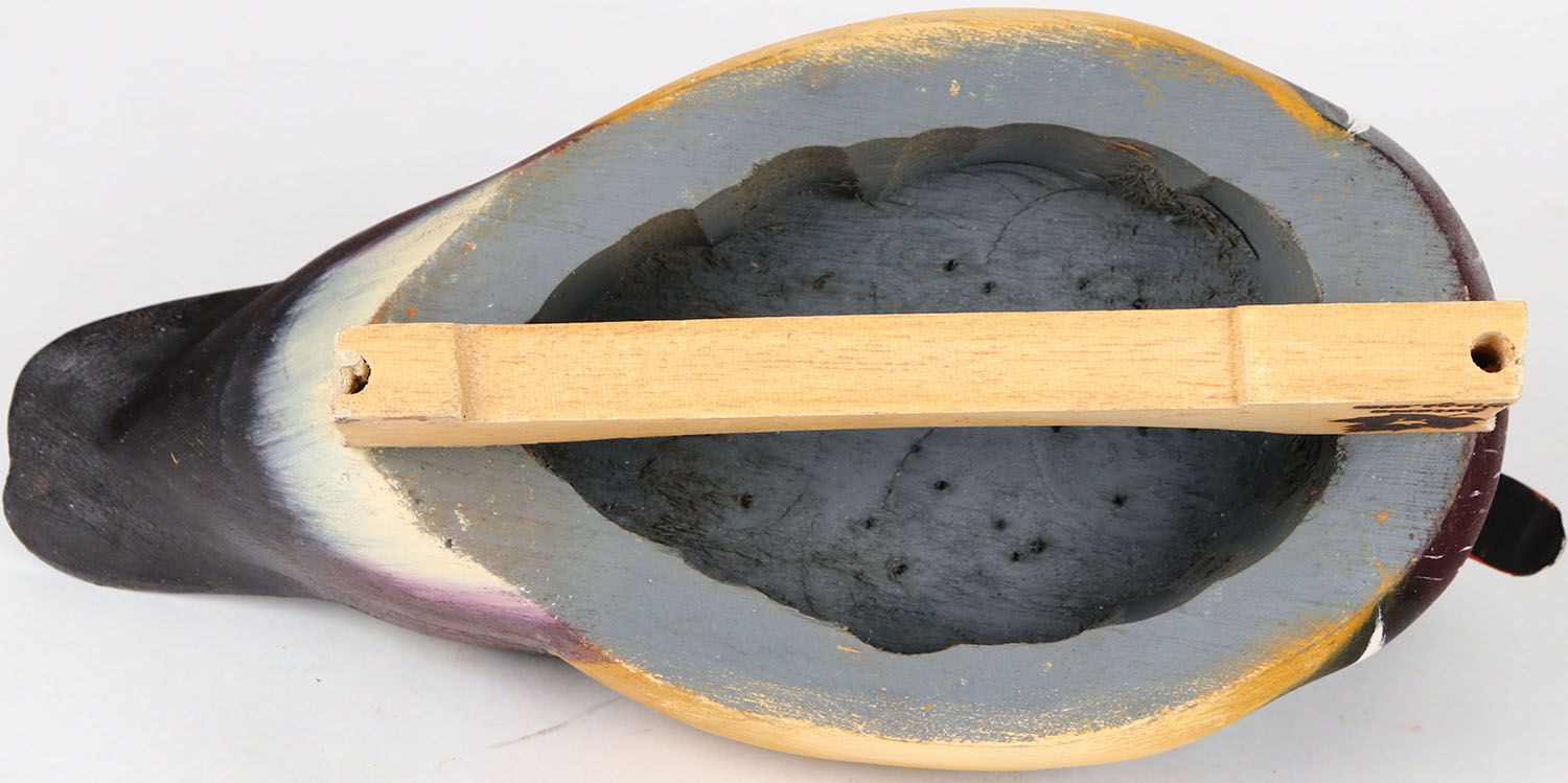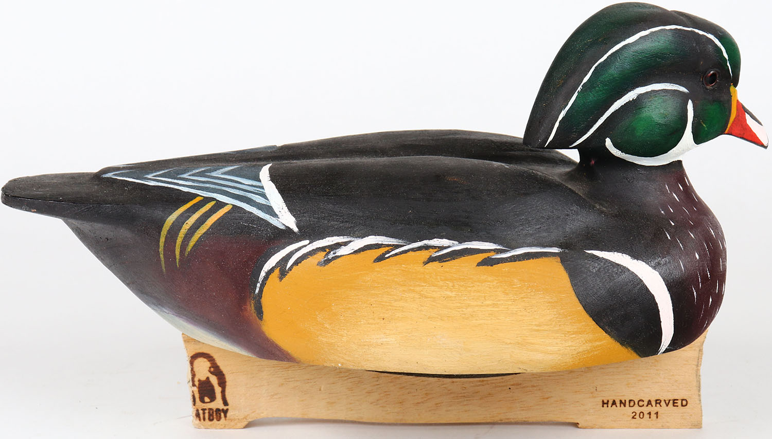 Wood Duck Drake by Autumn Wings Decoys, glass eyes, structurally excellent, hollow wood, branded by Autumn Wings Decoys on bottom, original paint. Grade: MINT - Value: 20 to 40