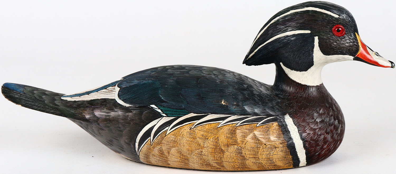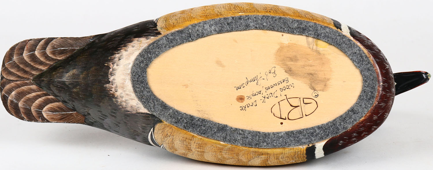 Wood Duck Drake by Bob Thompson, glass eyes, structurally excellent, solid bass wood / acrylic, signed and branded on bottom, original paint. Grade: MINT - Value: 30 to 60