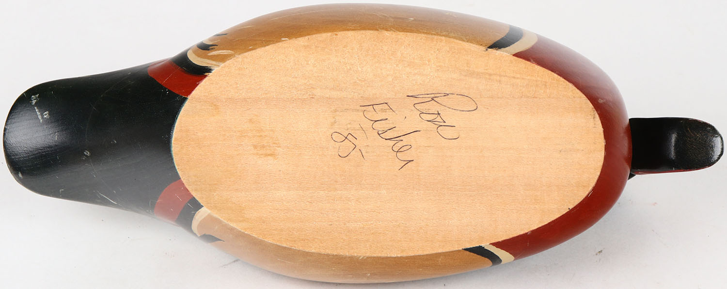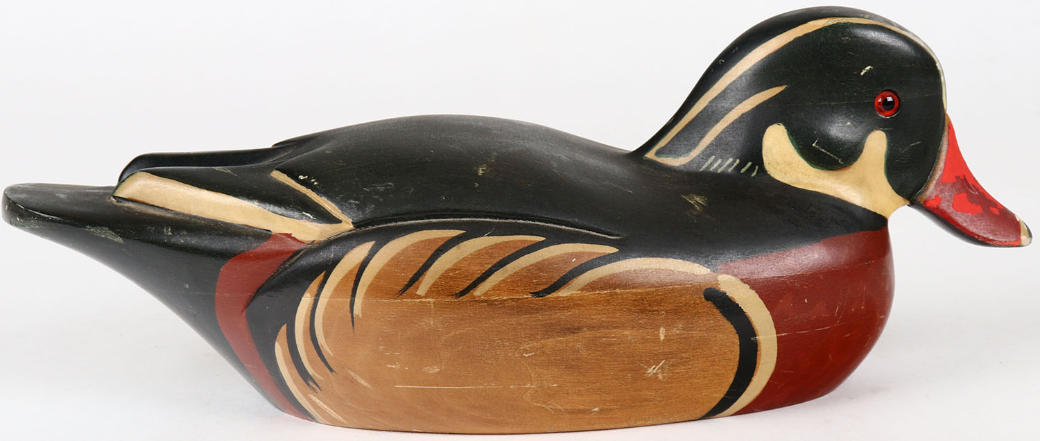 Wood Duck Drake by Ron Fisher, glass eyes, structurally excellent, solid wood, original paint. Grade: Excellent - Value: 40 to 80