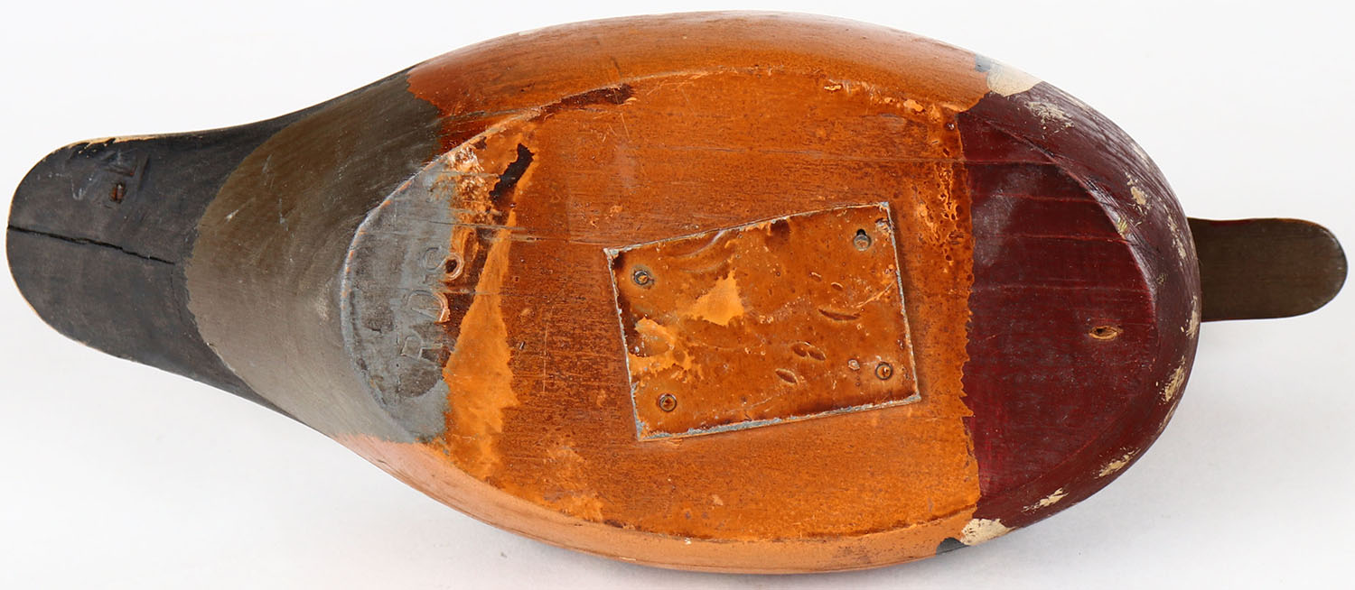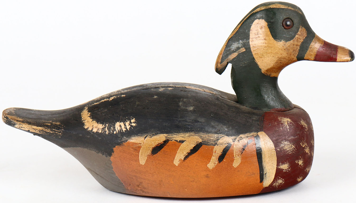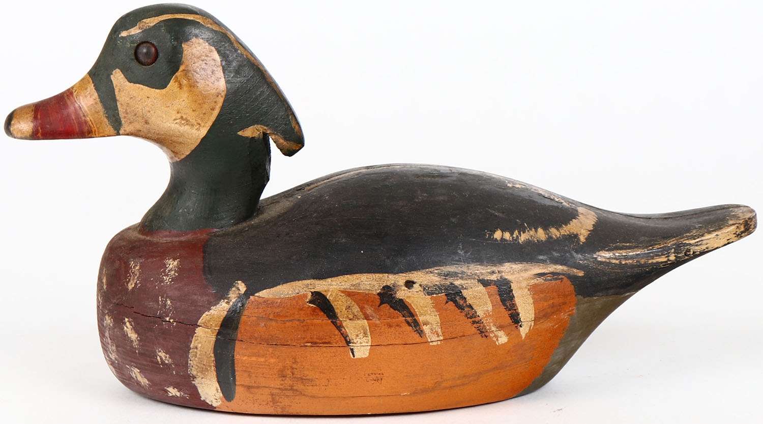 Wood Duck Drake by RDS, glass eyes, has age cracks under neck and on body, solid wood, branded RDS on bottom, original paint. Grade: Excellent - Value: 40 to 80