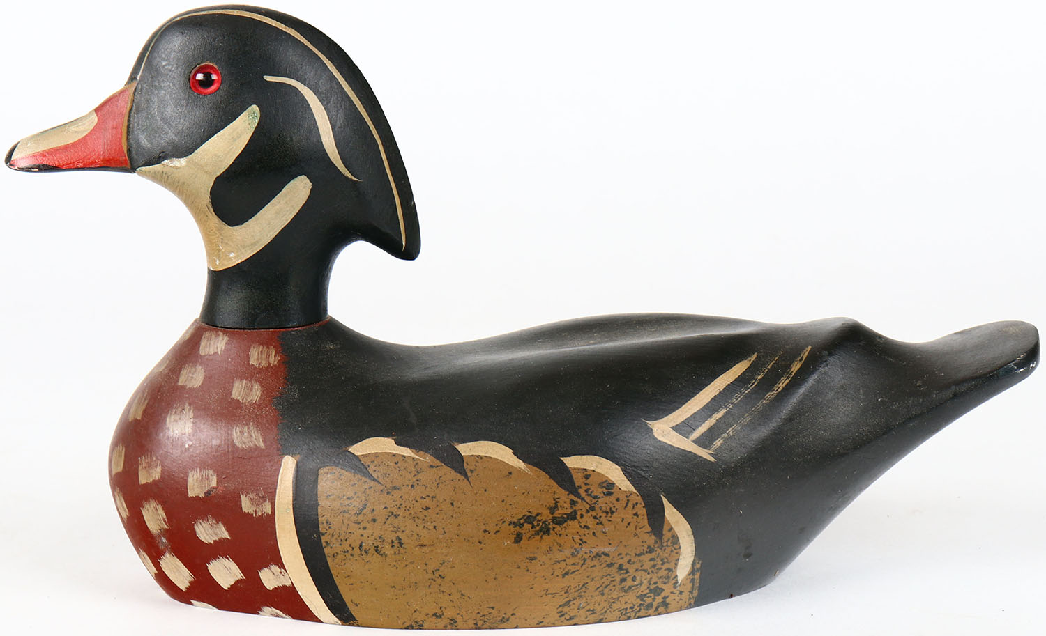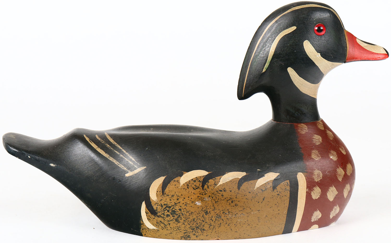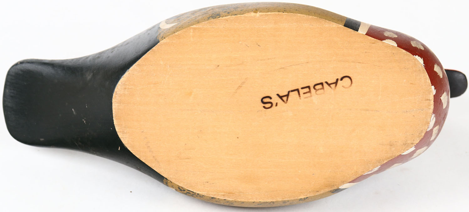 Wood Duck Drake by Cabela's, glass eyes, structurally excellent, solid wood, branded by CABELA'S on bottom, original paint. Grade: MINT - Value: 40 to 80