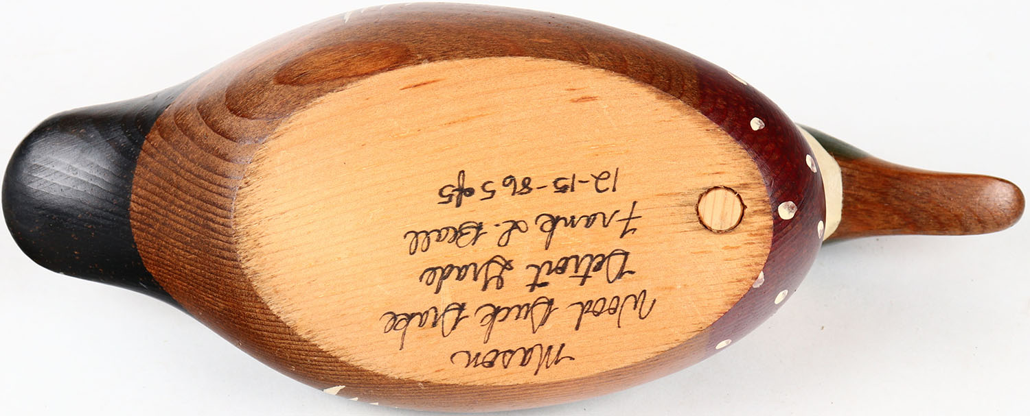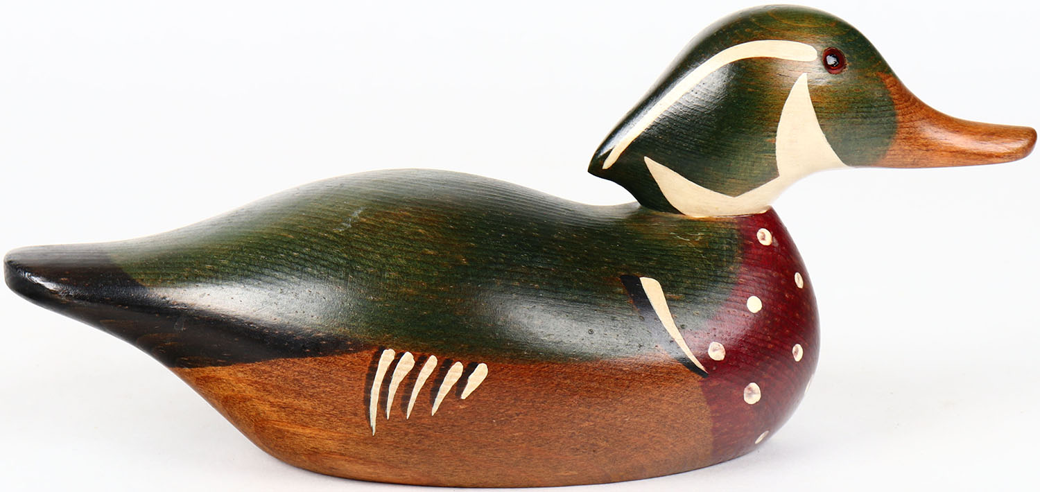 Wood Duck Drake by Frank L. Blall, glass eyes, structurally excellent, solid wood, signed on bottom, original paint. Grade: MINT - Value: 30 to 60