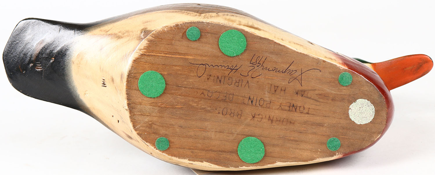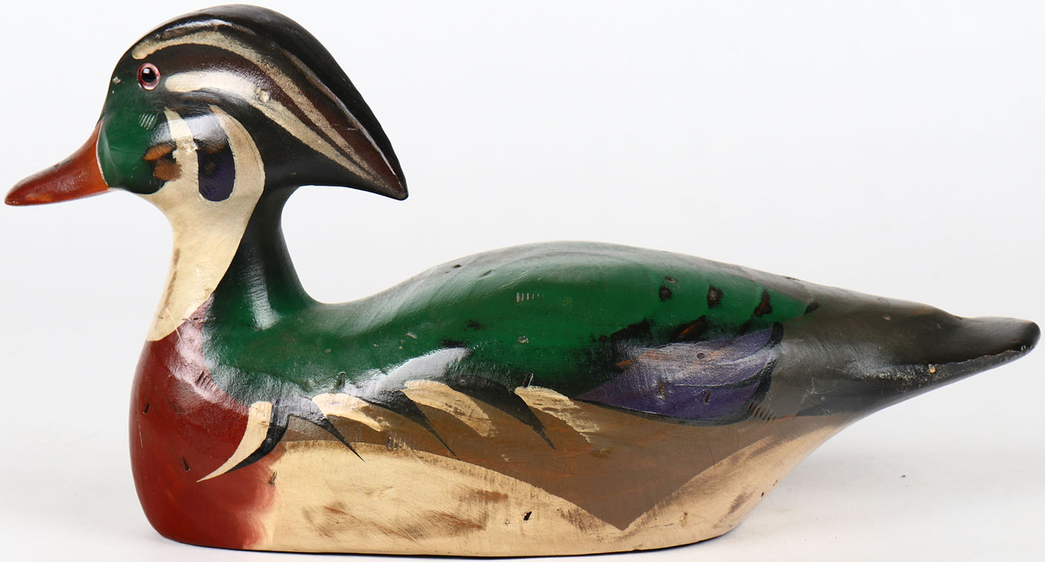 Wood Duck Drake by Raymond E. Howard, Hornick Bros Stoney Point Decoys, Oak Hall, Virginia, glass eyes, structurally excellent, solid wood, signed on bottom. Grade: Excellent - Value: 30 to 60