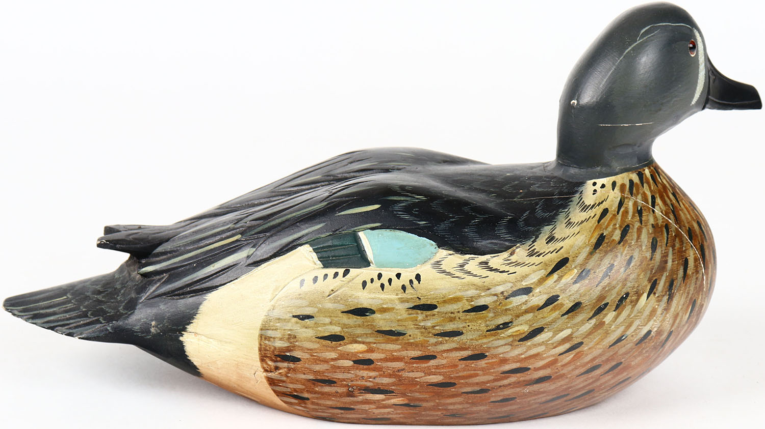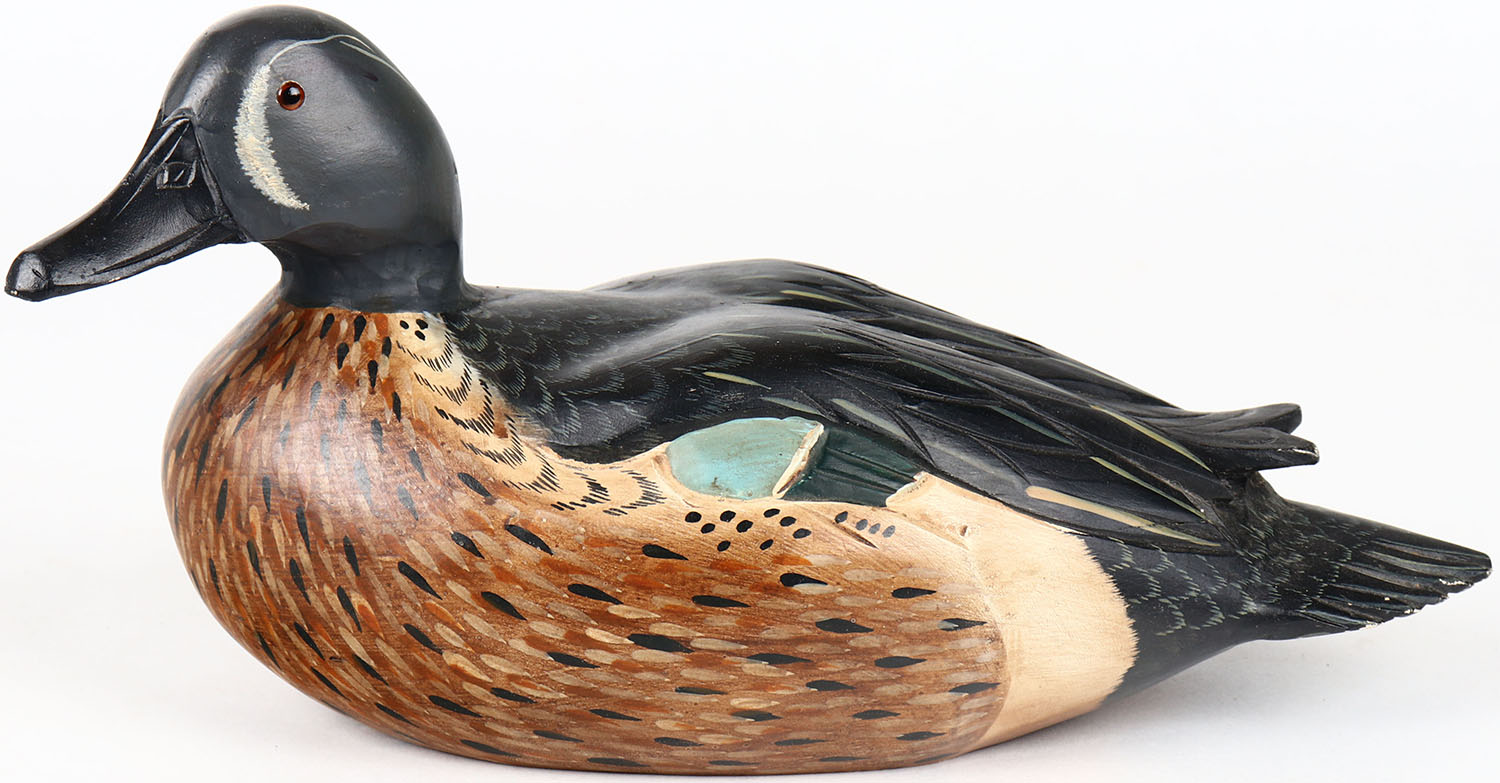 Blue Wing Teal Drake by Mike Borrett, WI, Ducks Unlimited, glass eyes, structurally excellent, solid wood, signed on bottom, original paint. Grade: MINT - Value: 30 to 60