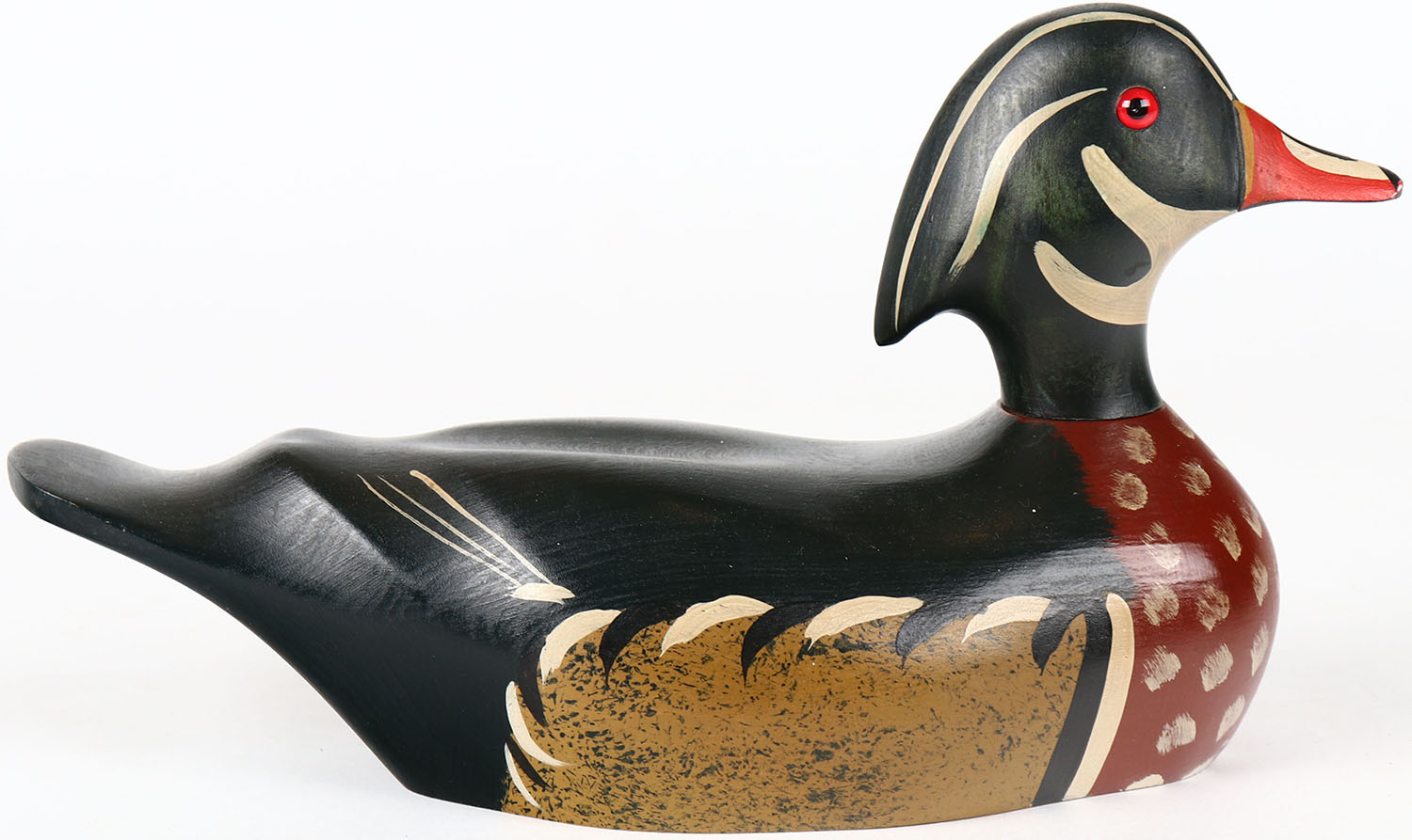 Wood Duck Drake by Cabela's, glass eyes, structurally excellent, solid wood, branded by CABELA'S on bottom, original paint. Grade: MINT - Value: 30 to 60