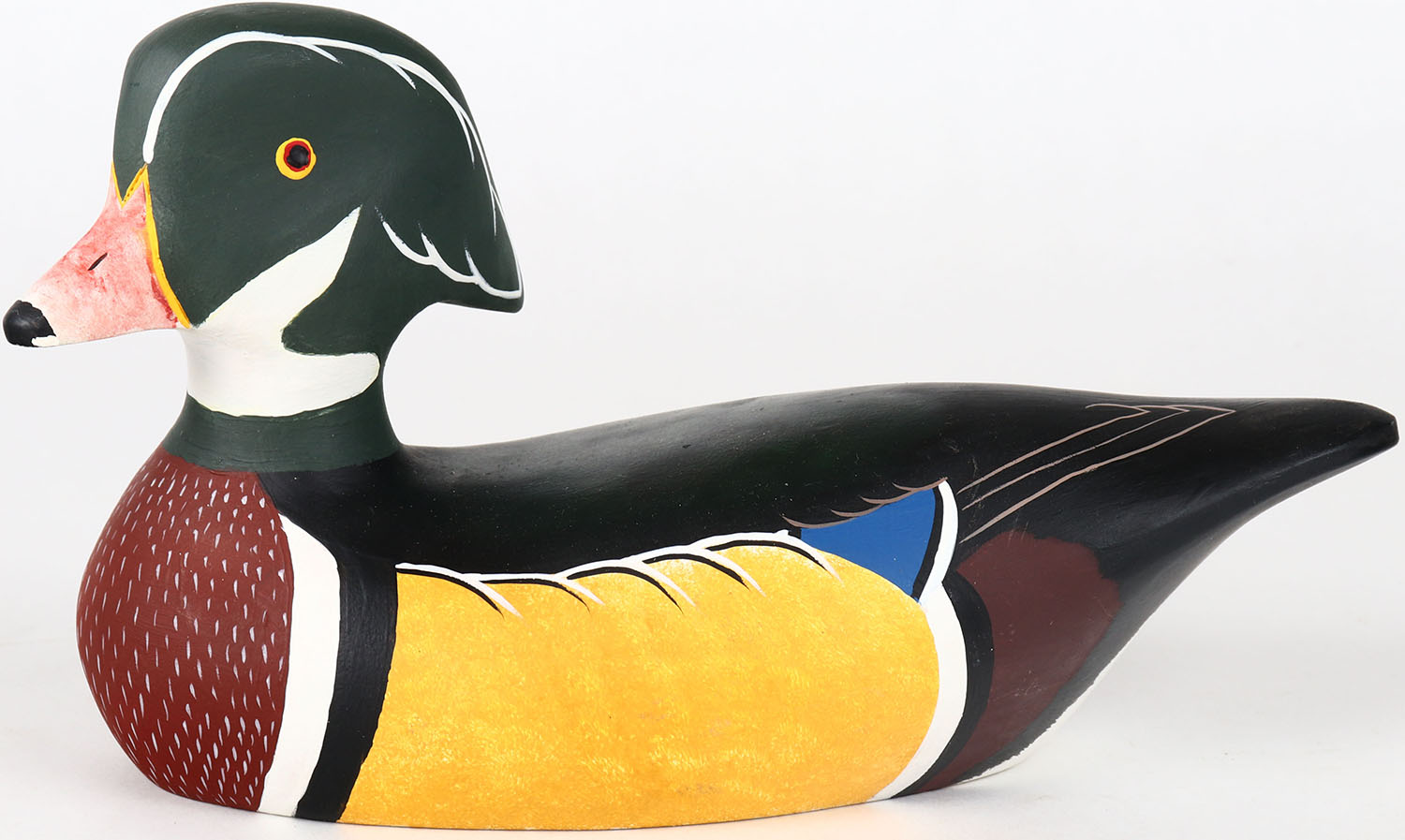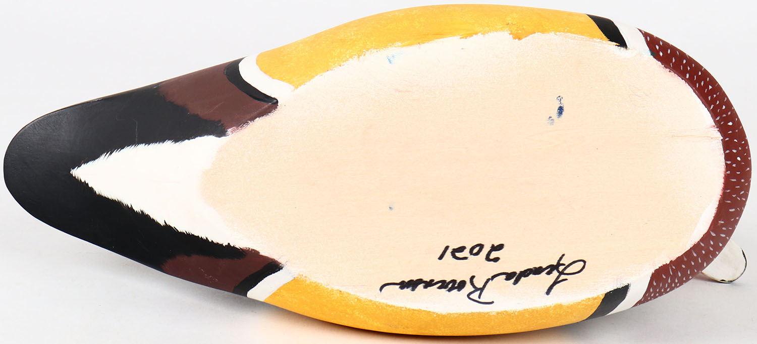 Wood Duck Drake by Linda ?, painted eyes, structurally excellent, solid wood, signed on bottom, original paint. Grade: Excellent ? - Value: 30 to 60