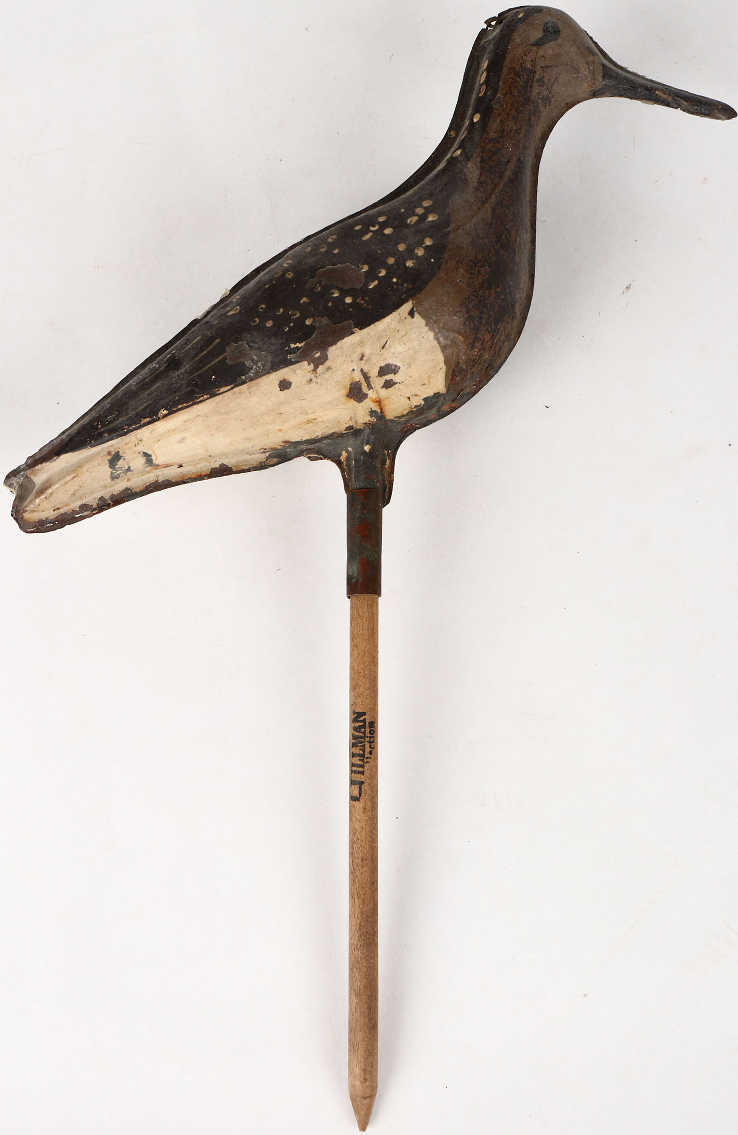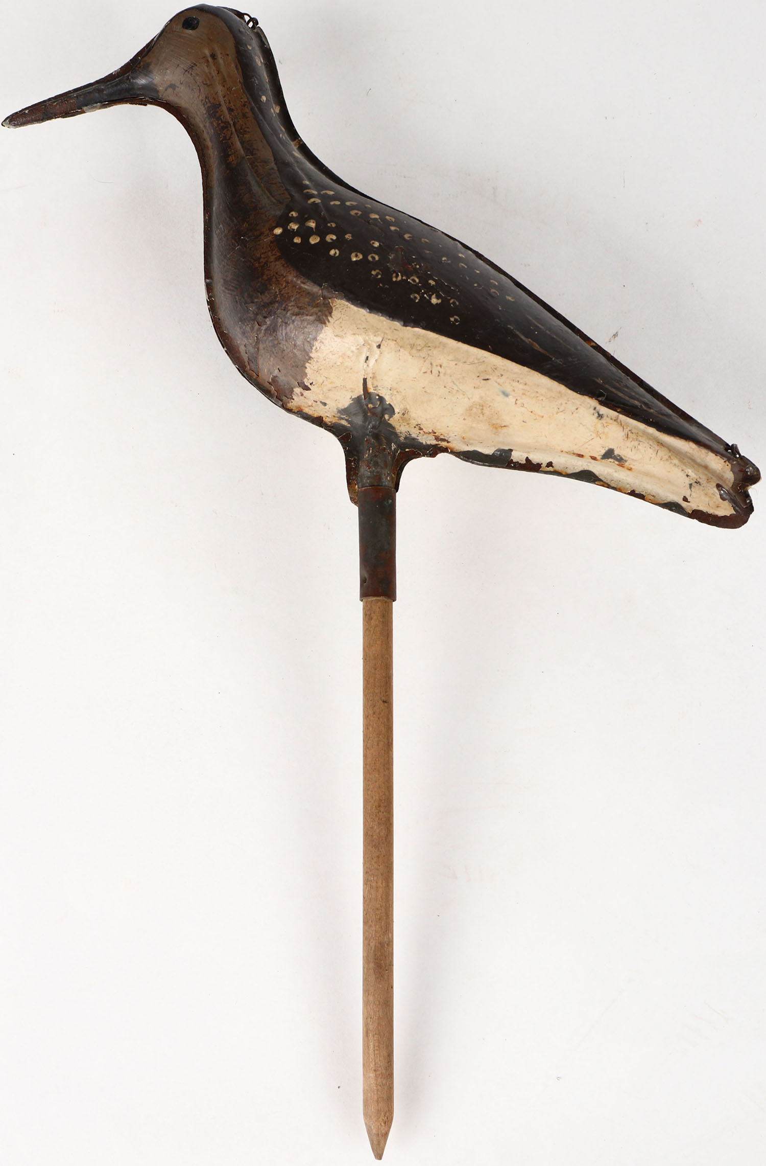 Metal 2pc. Tinny, Shorebird by Strater & Sohier, Boston MA, painted eyes, with wire hinges, wood dowel, original paint, 10'' OAL. Grade: Excellent - Value: 50 to 100