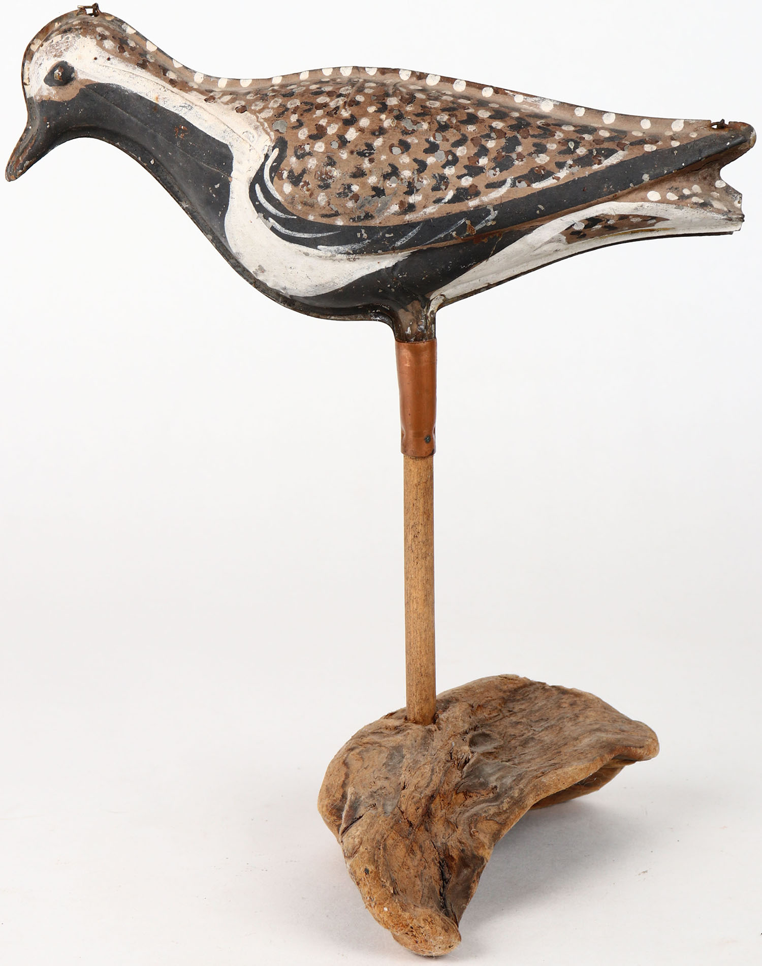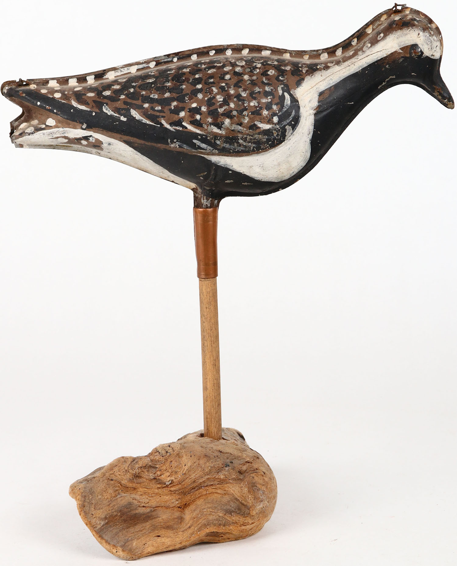 Metal 2pc. Tinny, Shorebird by Strater & Sohier, Boston MA, painted eyes, with wire hinges, dowel with base, original paint, 10'' OAL. Grade: Excellent - Value: 50 to 100