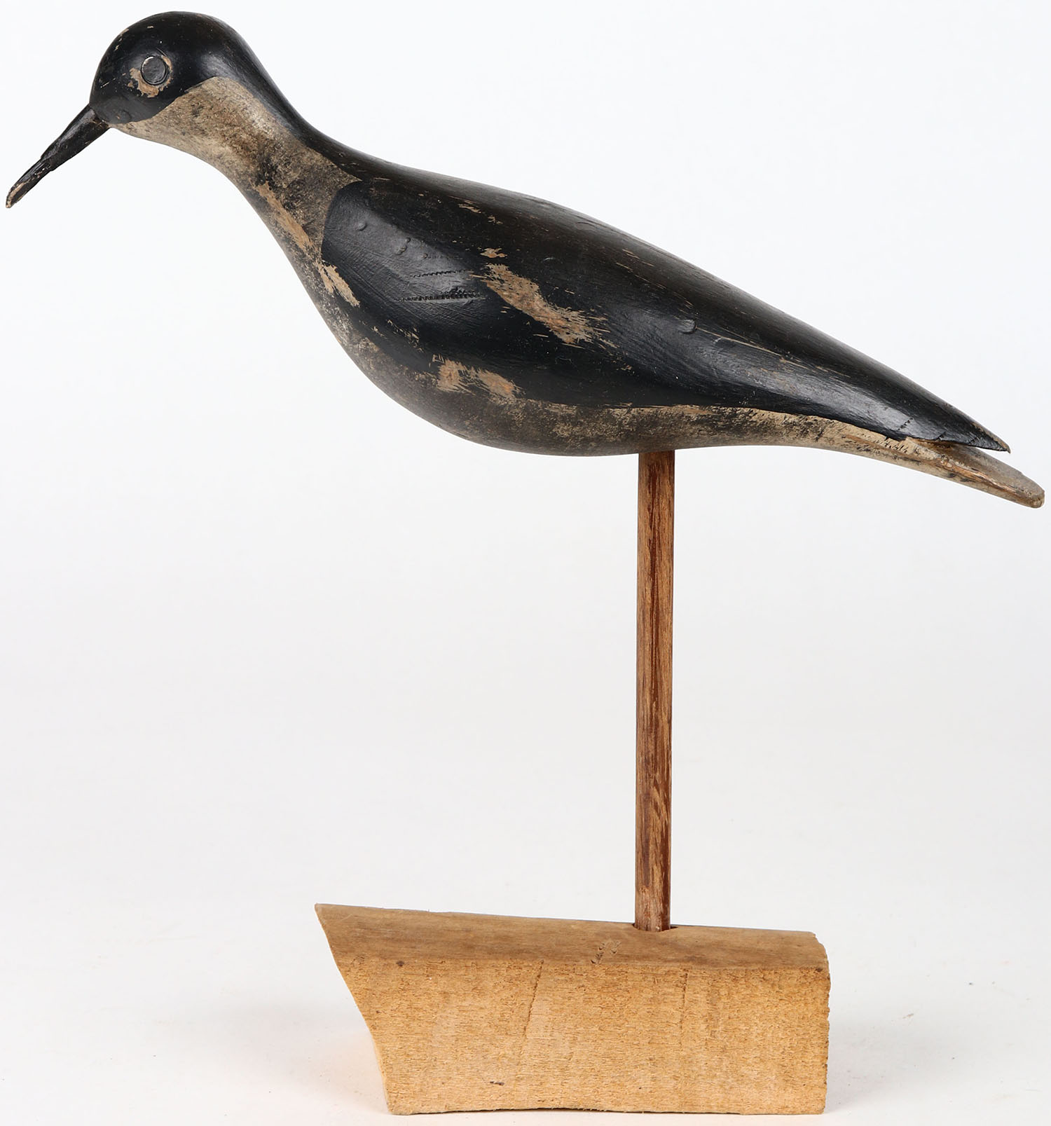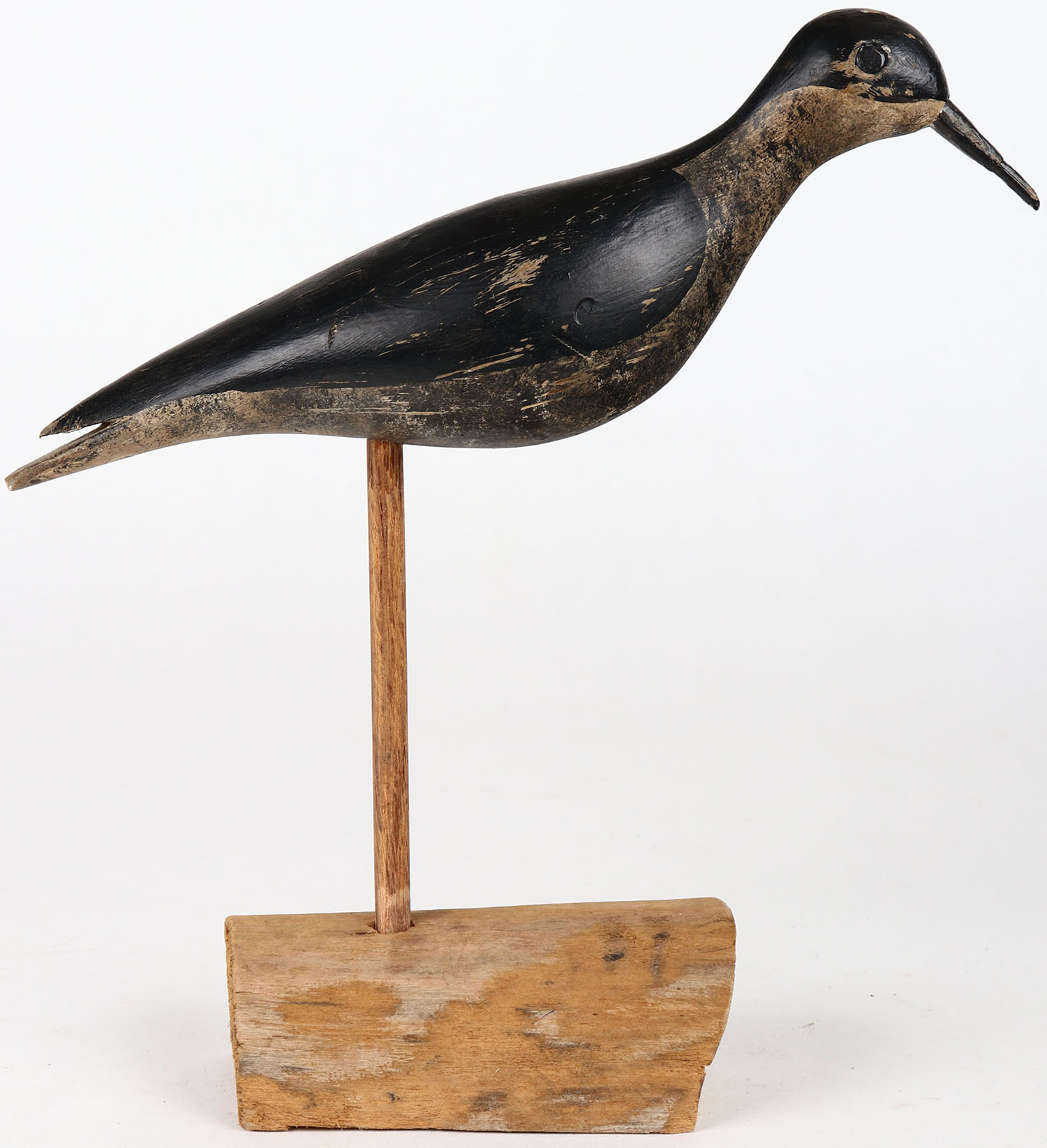 Shorebird by unknown maker, tack eyes, on wood stand, original paint. Grade: Excellent - Value: 50 to 100
