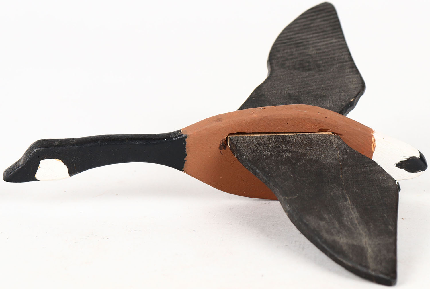 Miniature Flying Canada Goose by unknown maker, solid wood, painted eyes, original paint. Grade: Excellent ++ - Value: 10 to 20
