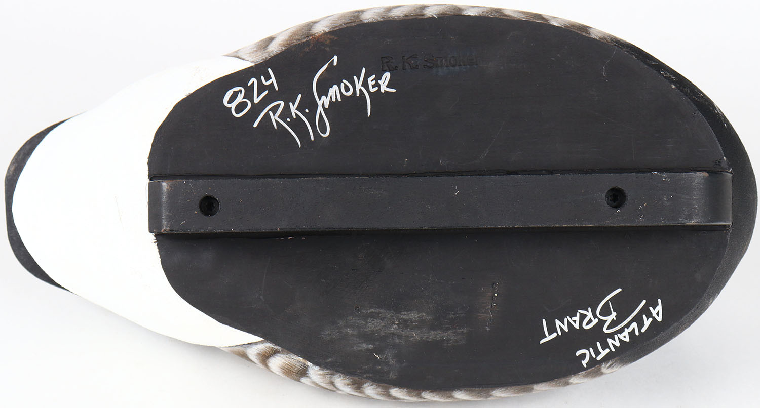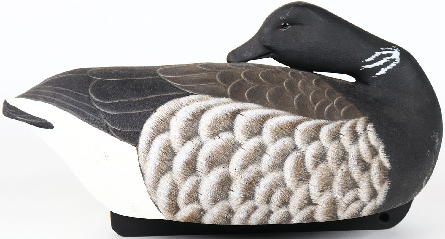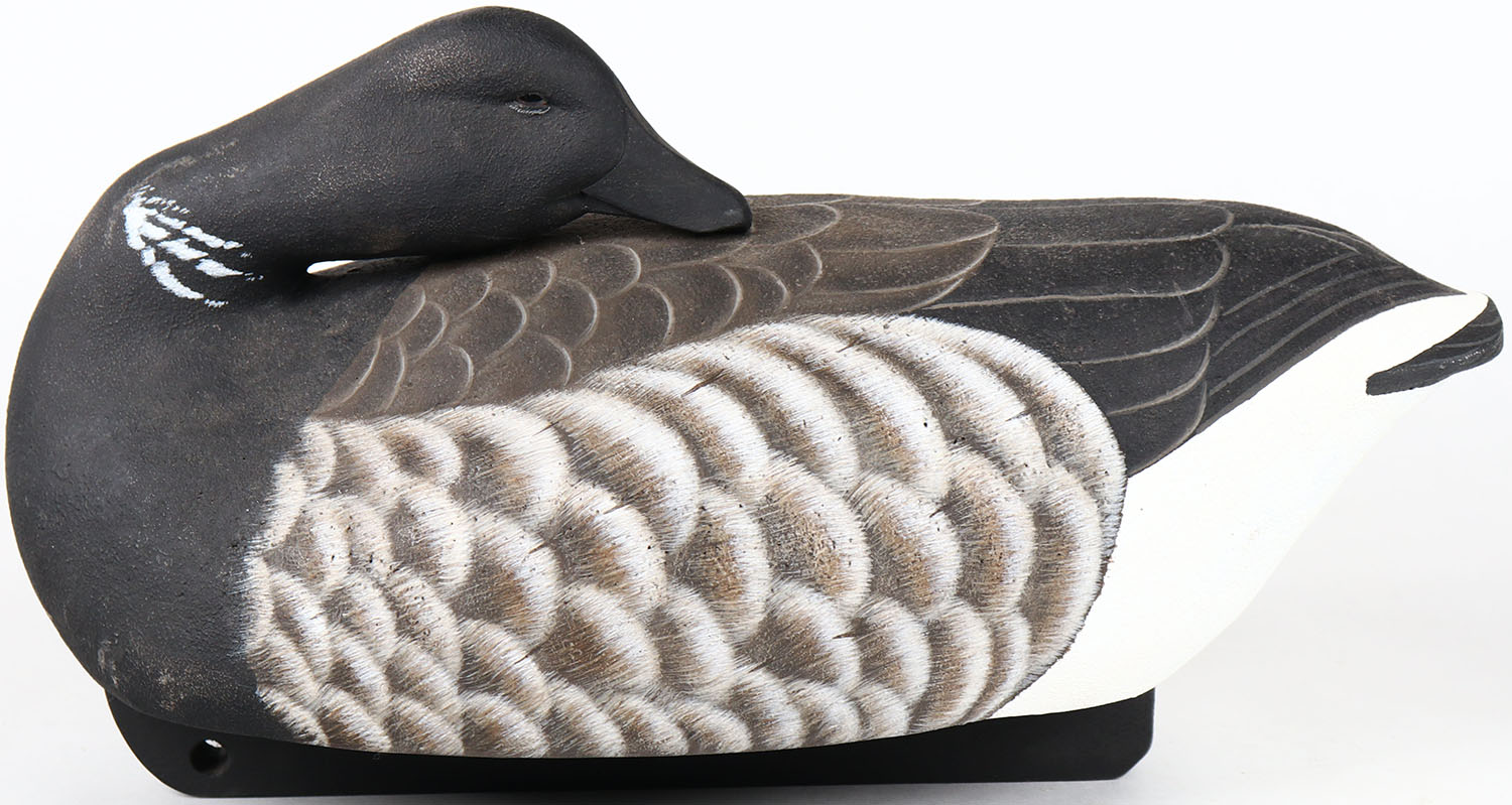 Sleeping Black Brant by R.K. Smoker, glass eyes, solid wood, structurally excellent, signed and branded on bottom, original paint. Grade: MINT - Value: 100 to 200