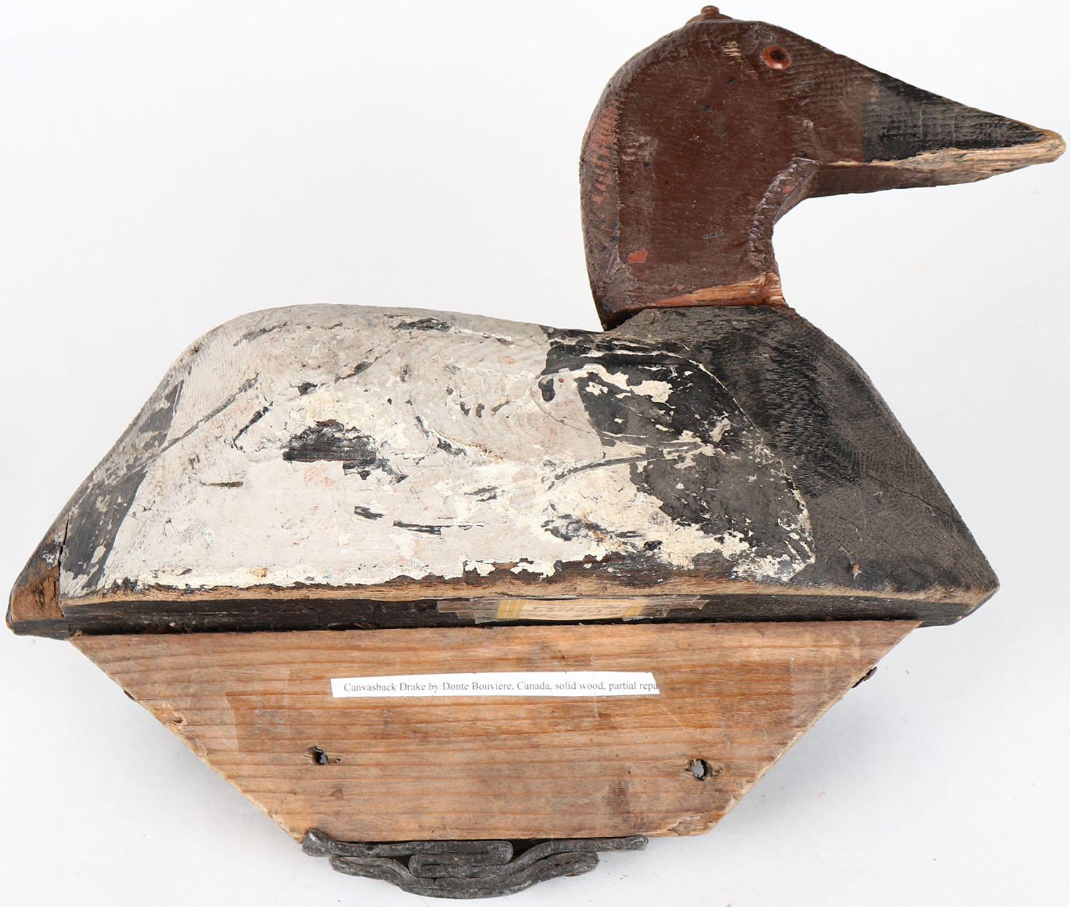 Canvasback Drake by D. Bovier, Manitoba, CAN, tack eyes, solid wood, has age cracks on body, bill is broken underneath, signed on bottom, original paint. Grade: Very Good - Value: 20 to 40