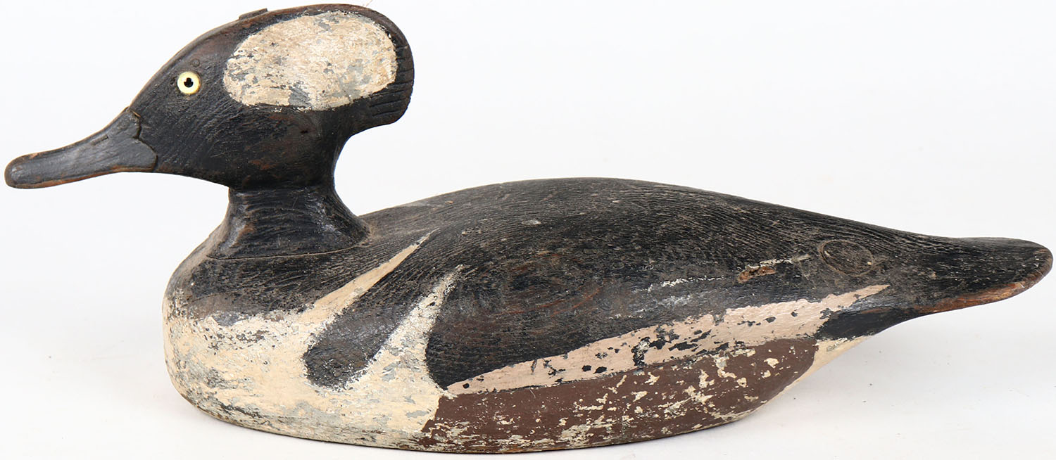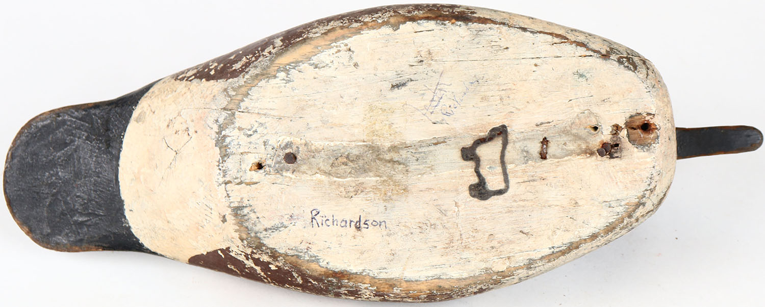 Hooded Merganser Drake by Richardson, glass eyes, solid wood, has age cracks on body, signed on bottom, original paint. Grade: Very Good ++ - Value: 50 to 150