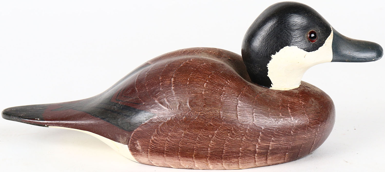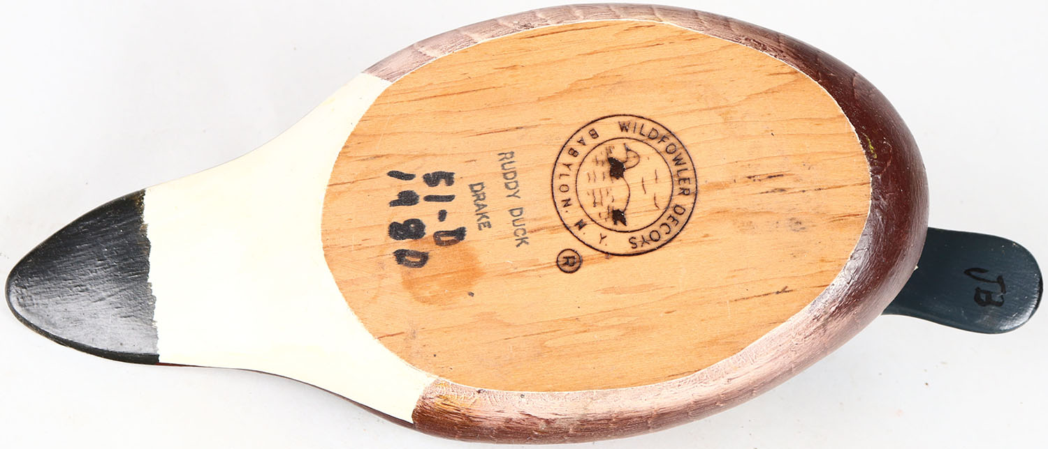 Ruddy Duck Drake by Wildfowler Decoys, Babylon, N.Y, glass eyes, solid wood, structurally excellent, branded on bottom, original paint. Grade: MINT - Value: 30 to 150