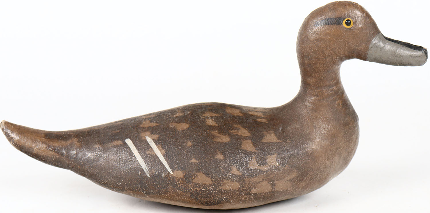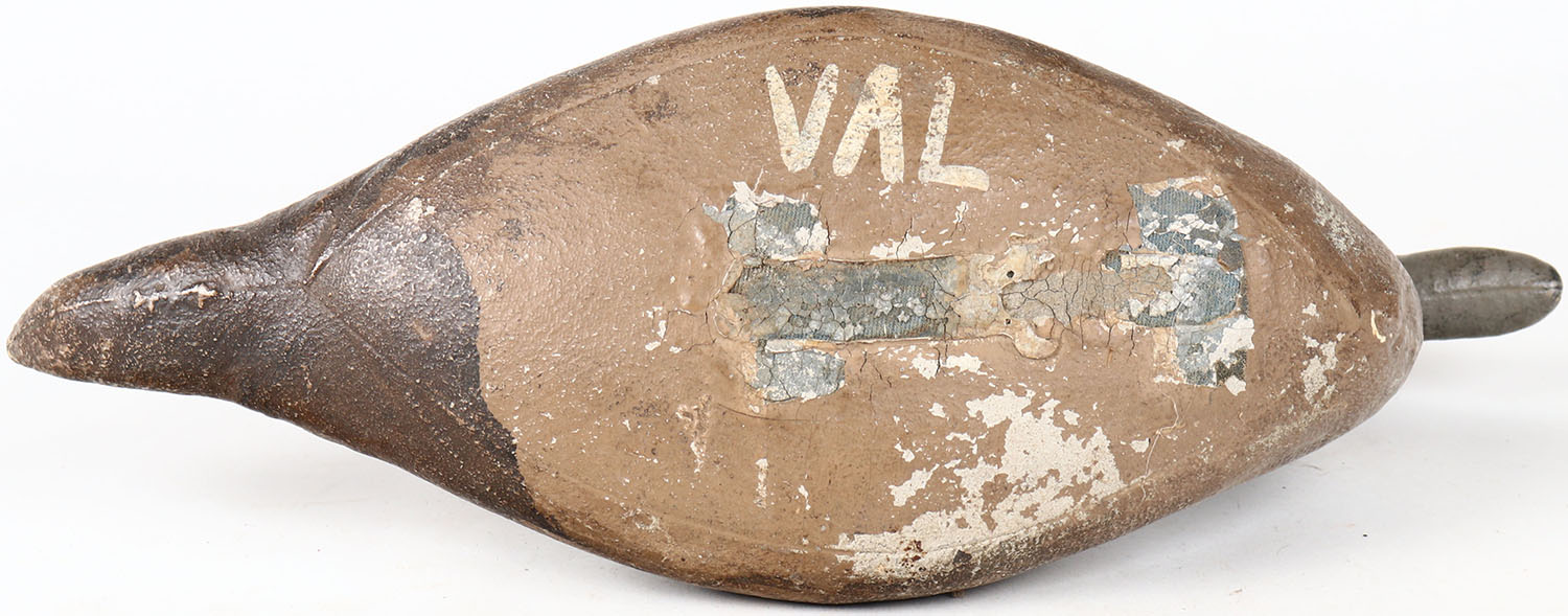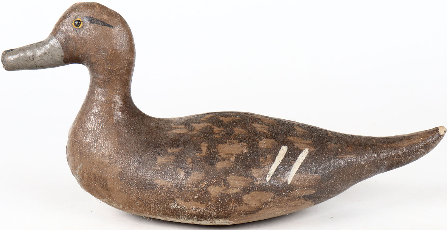 Pintail Hen by Scott Cork Decoy Company, PTD, Oakland, canvas over cork, glass eyes, branded VAL on bottom, original paint. Grade: Excellent - Value: 50 to 100