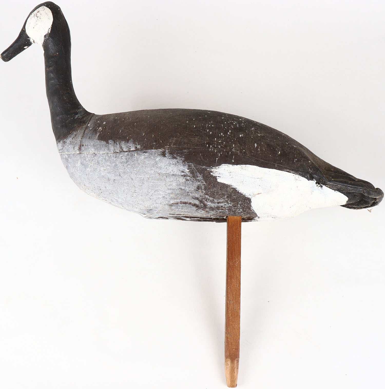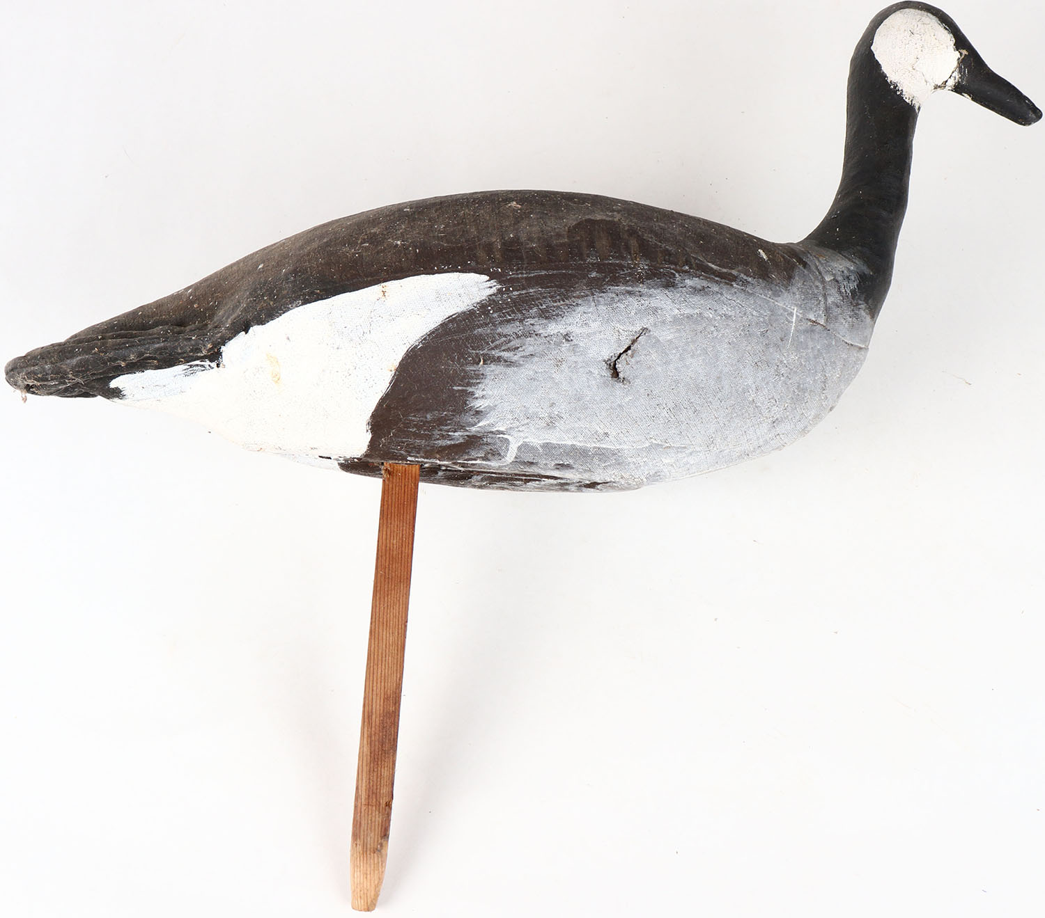 Canada Goose by unknown maker, has wooden stake, canvas over cork, no eyes, original paint. Grade: Excellent - Value: 30 to 100