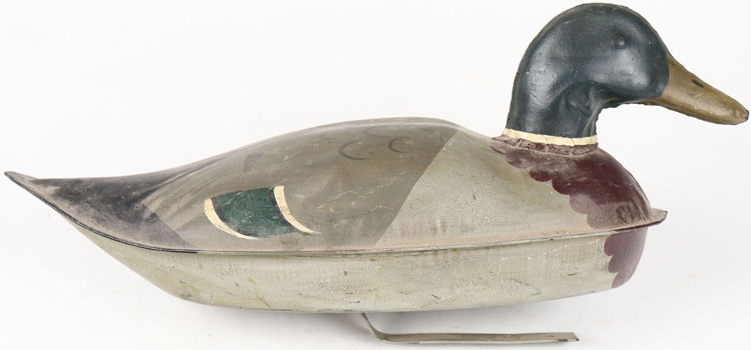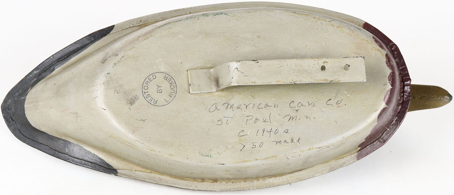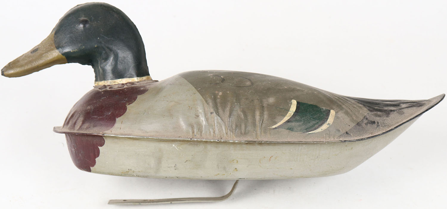 Metal Mallard Drake restored by Larry Rucker, St. Paul M.N, painted eyes, hollow metal, original paint. Grade: Excellent - Value: 50 to 100