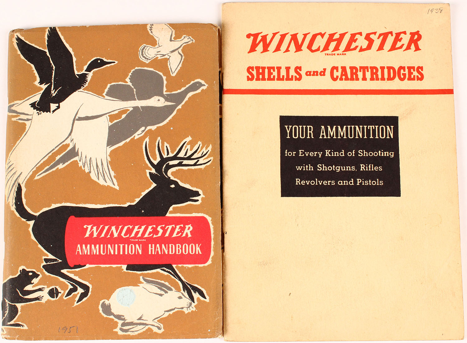 Lot of 2 Winchester Ammunition Handbooks, the tan one is 1939, 6'' x 9''. And the brown one is 1951, 5 1/2'' x 8''. Both staplebound, softcovers good. Grade: Excellent - Value: 2 to 100