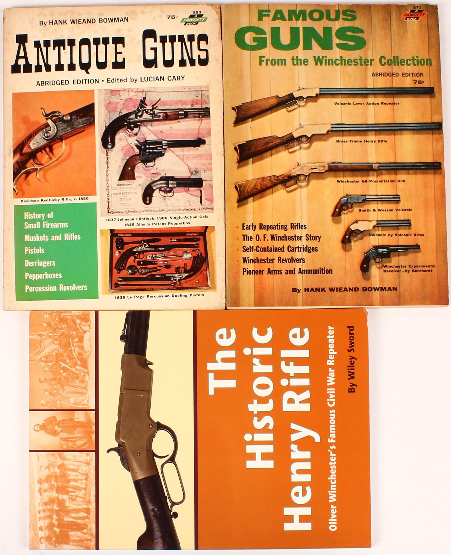 Lot of 3 Gun Books. (1) The Historic Henry Rifle by Wiley Sword, 7'' x 10''. (1) Famous Guns From the Winchester Collection by Hank Wieand Bowman, 6 1/2'' x 9 1/2''. (1) Antique Guns Abridged Edition by Hank Wieand Bowman, 6 1/2'' x 9 1/2''. All softcovers very good, pages clean, bindings tight. Grade: Very Good ++ - Value: 6 to 60