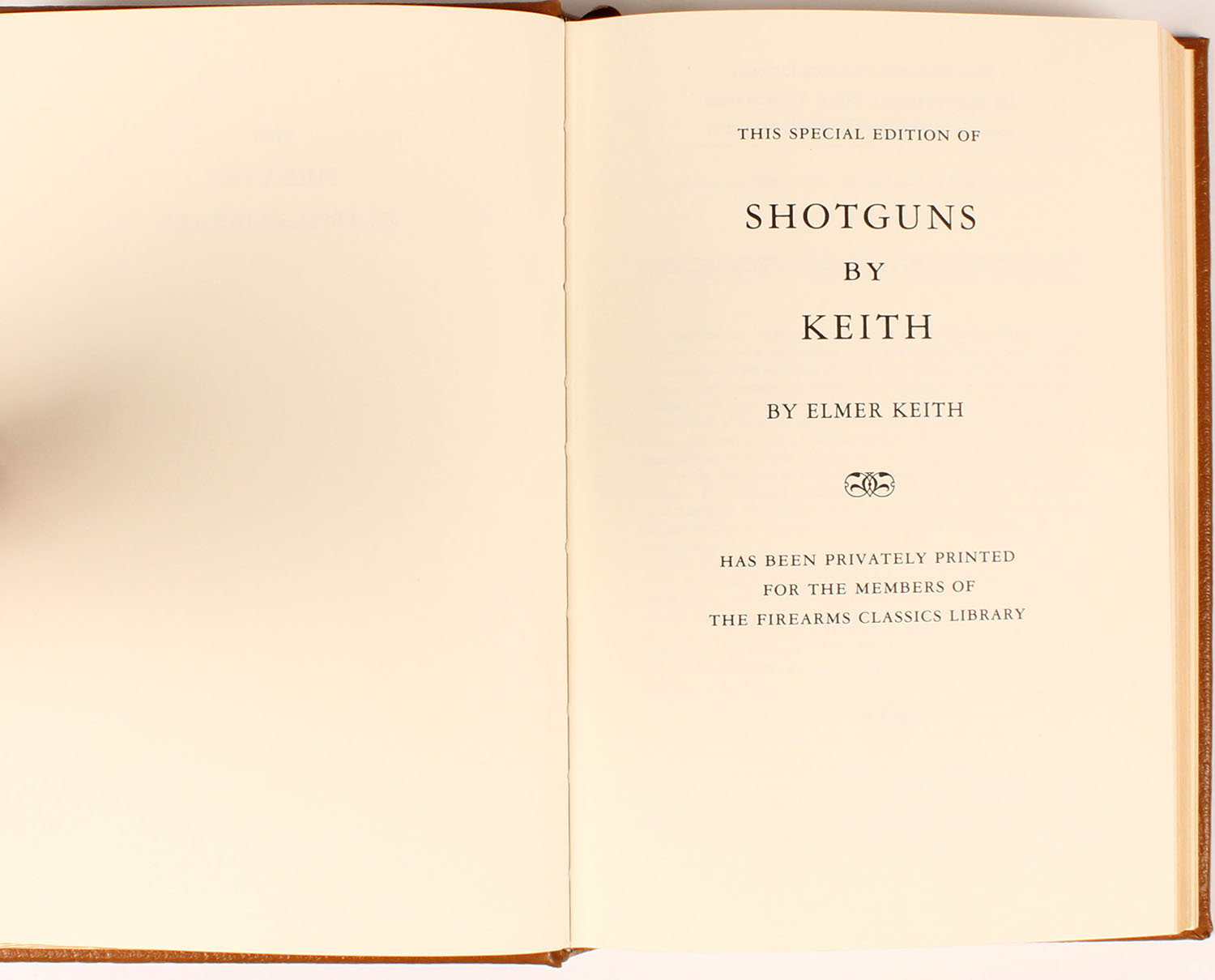 The Special Edition of Shotguns by Keith by Elmer Keith 1995, 6'' x 9''. 307 pages, silk endpapers & a ribbon marker, pages clean, binding tight, hardcover mint, B/W images. Value: $75 Grade: MINT - Value: 4 to 80