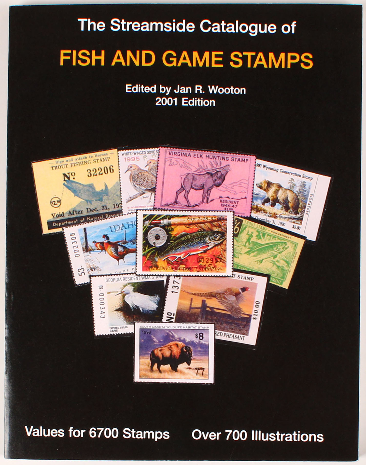 The Streamside Catalogue of Fish and Game Stamps Edited by Jan R. Wooton 2001 edition, values for 6700 stamps over 700 illustrations, 8 1/2'' x 11''. 210 pages, pages clean, binding tight, softcover excellent. Grade: Excellent ++ - Value: 2 to 100