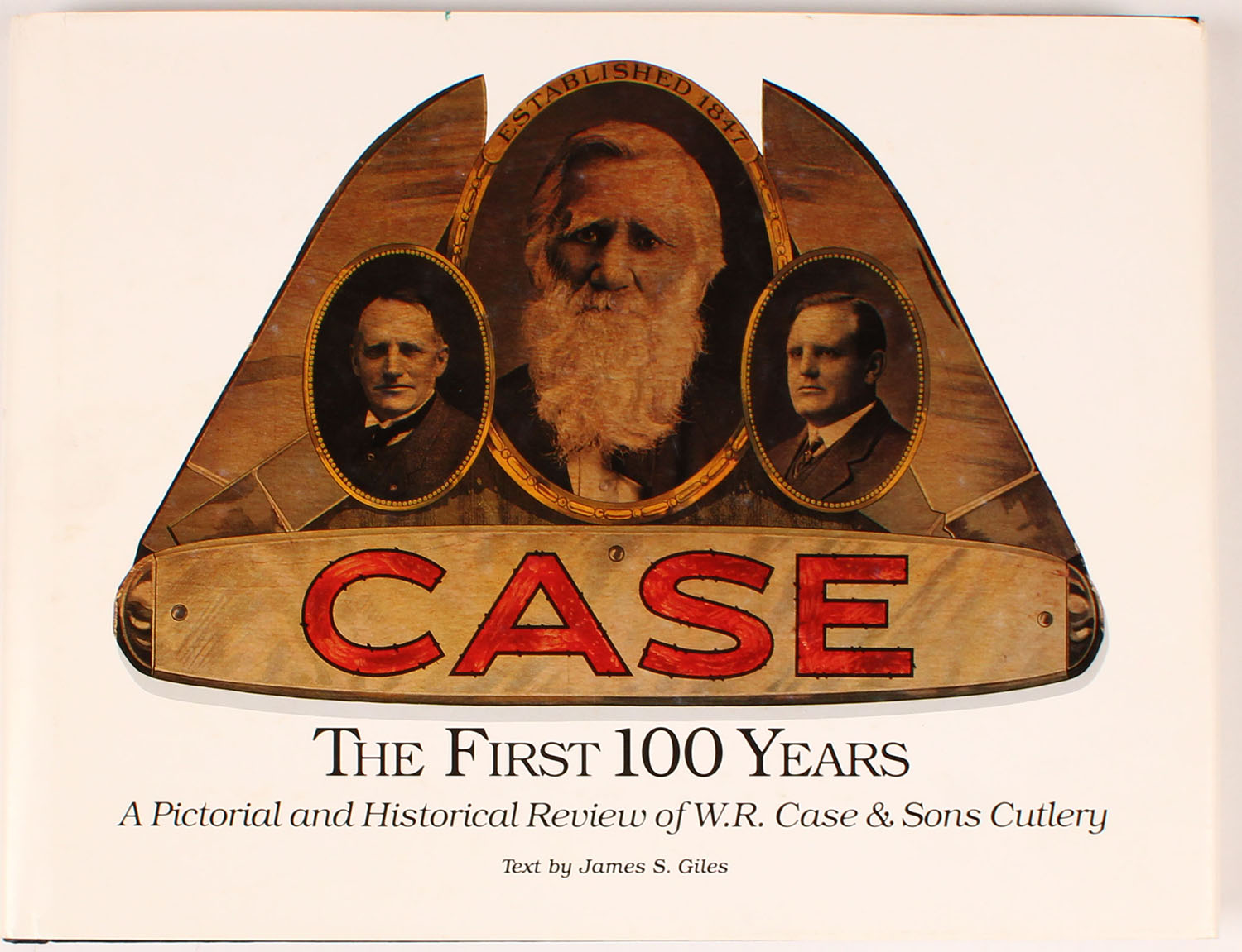 Case The First 100 Years A Pectoral and Historical Review of W.R. Case & Sons Cutlery by James S. Giles, Premiere Edition October 1989. 11 1/2'' x 9'', 192 pages. Hardcover has gilt and is mint, dustcover has a green dot on it and minor tear near spine, full color and b/w images, binding tight, pages clean. Value: $500 Grade: Excellent ++ - Value: 20 to 200