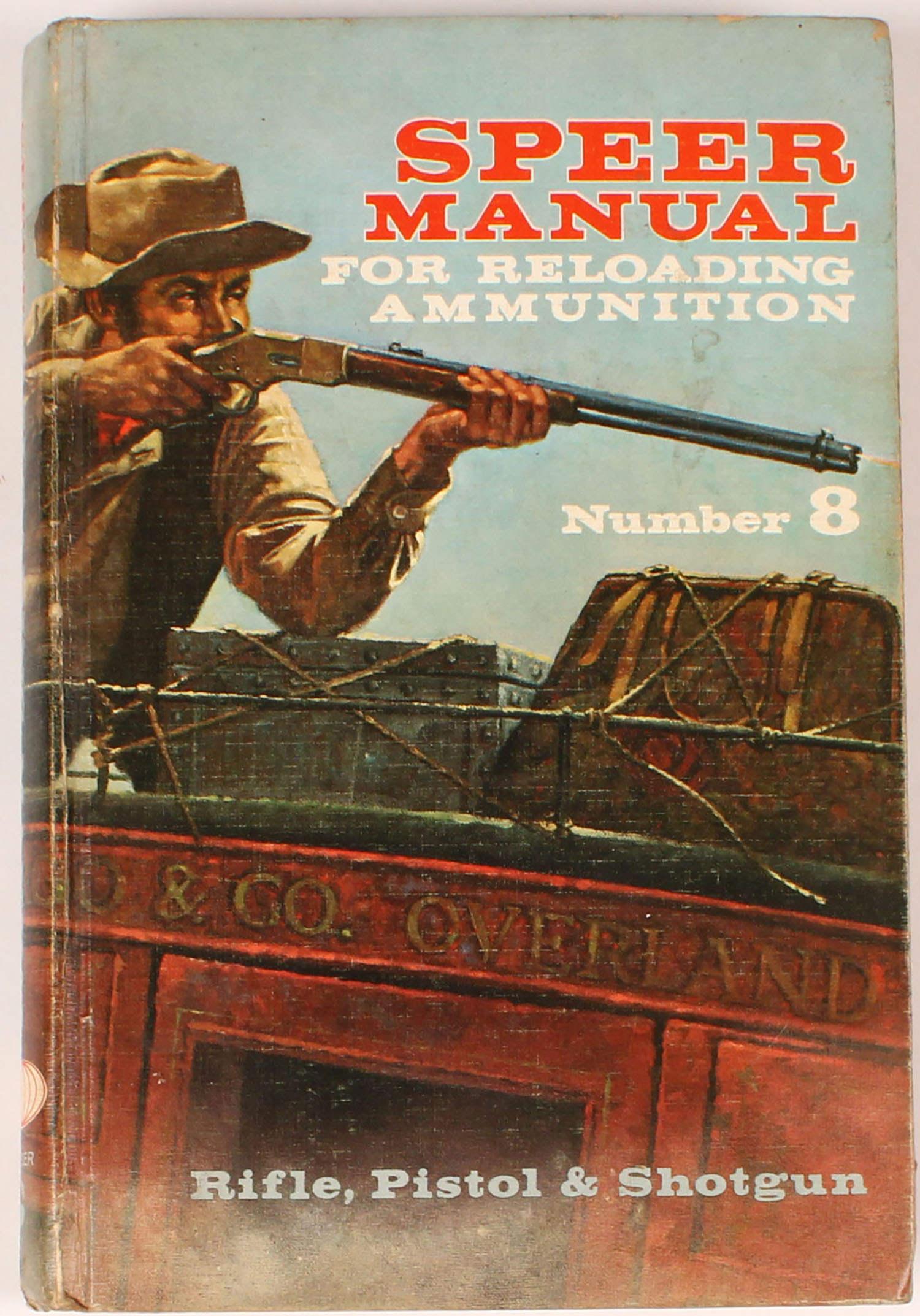 Speer Manual for Reloading Ammunition Number 8, 1970, 5 1/2'' x 8 1/4'', 448 pages. Hardcover very god some creasing on binding, b/w images, pages clean. Value: $244 Grade: Very Good ++ - Value: 2 to 100