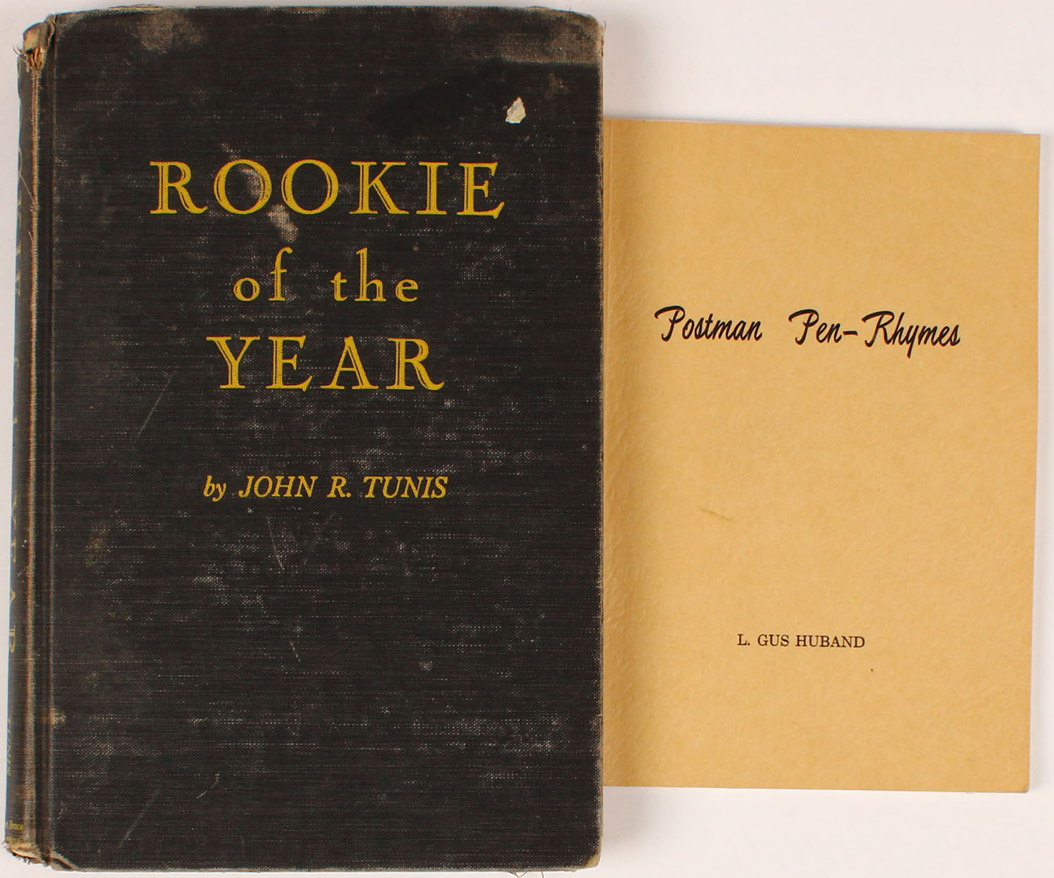 Lot of 2 (1) Rookie of the Year by John R. Tunis 1944, 5 1/2'' x 8 1/2''. Hardcover very good. (1) Postman Pen-Rhymes by L. Gus Huband, 4 1/2'' x 6 1/2'' SIGNED BY AUTHOR, softcover excellent. Grade: Excellent - Value: 2 to 100