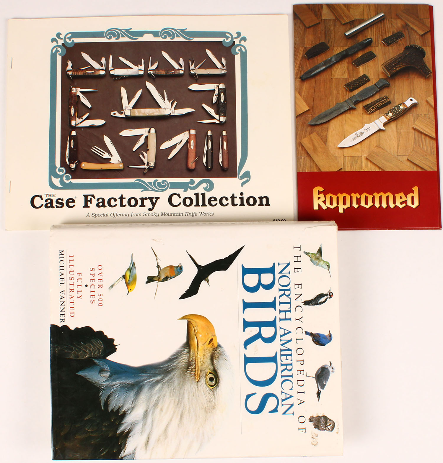 Lot of 3 (1) The Encyclopedia of North American Birds by Michael Vanner , 2002, 9'' x 11'', 384 pages, full color images, pages clean, binding tight, dustcover. (1) The Case Factory Collection A Special Offering From Smokey Mountain Knife Works, 48 pages, 11 1/2'' x 8 1/2'', full color images, softcover. (1) Kopromed knife pamphlets and pictures. Grade: Excellent ++ - Value: 2 to 100