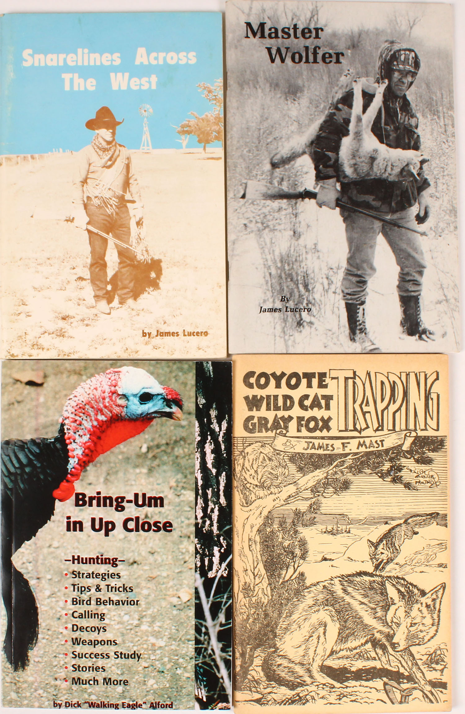 Lot of 4 (1) Bring-Um in Up Close by Dick ''Walking Eagle'' Alford, 5 1/2'' x 8 2/3''. 126 pages. (1) Coyote Wild Cat Gray Fox Trapping by James F. Mast 1943, 5 1/2'' x 8 1/2''. 88 pages. (1) Snarelines Across The West by James Lucero 1986, 5 1/2'' x 8 1/2''. 88 pages. (1) Master Wolfer by James Lucero 1988, 5 1/2'' x 8 1/2''. Grade: Excellent - Value: 6 to 60