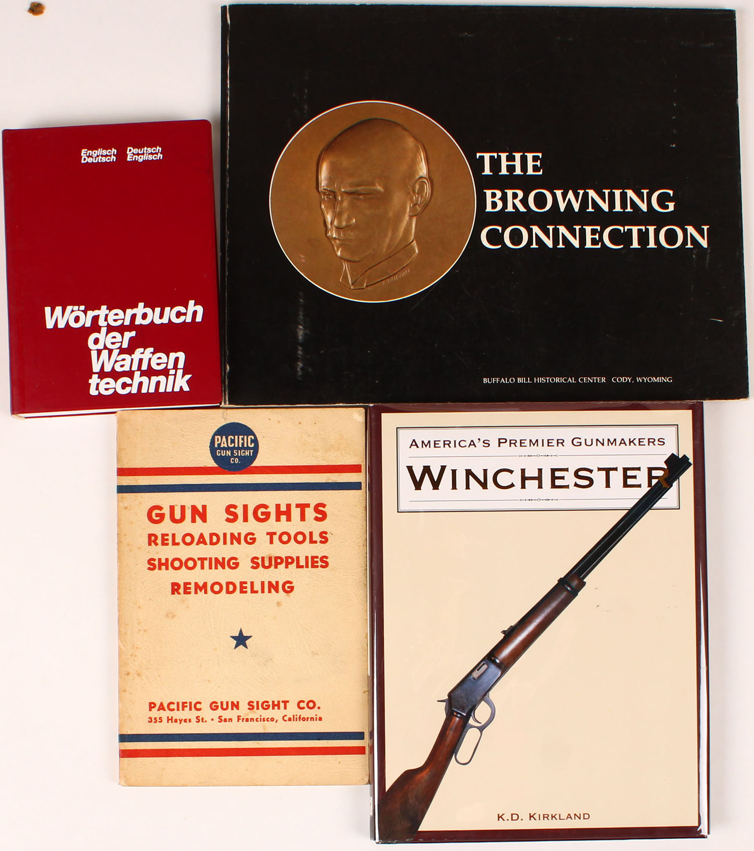 Lot of 4 (1) The Browning Connection Buffalo Bill Historical Center Cody, Wyoming. (1) Americas Premier Gunmakers Winchester by K.D. Kirkland. (1) Gun Sights Reloading Tools, Shooting Supplies, Remodeling. (1) Worterbuch der Waffen technik. Grade: Excellent - Value: 2 to 100