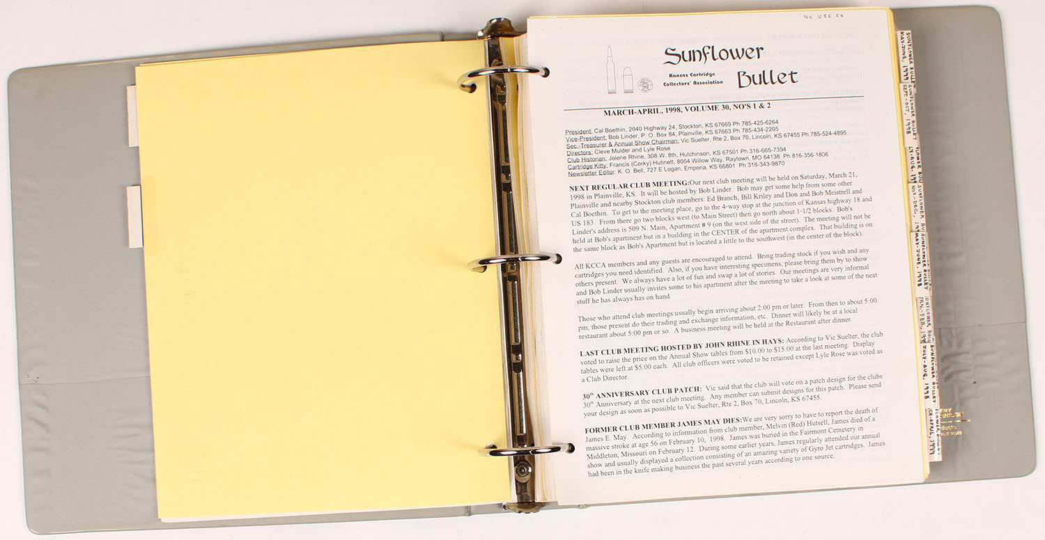 Large lot of KCCA Kansas sunflower bullet, Jim Richards CTG. Transfer group, Frank Baldridge, Chamberlain book reloading tools, bud appel information in a 3 ring binder. Grade: Excellent - Value: 2 to 100