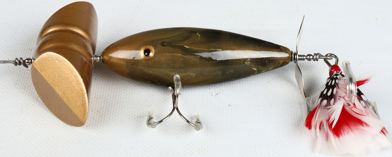 South Bend? Whiri-Oreno with extra wood lure & feather skirt, , PE, gold/marble green lure, 2 hooks, very nice condition. Grade: Excellent - Value: 40 to 100