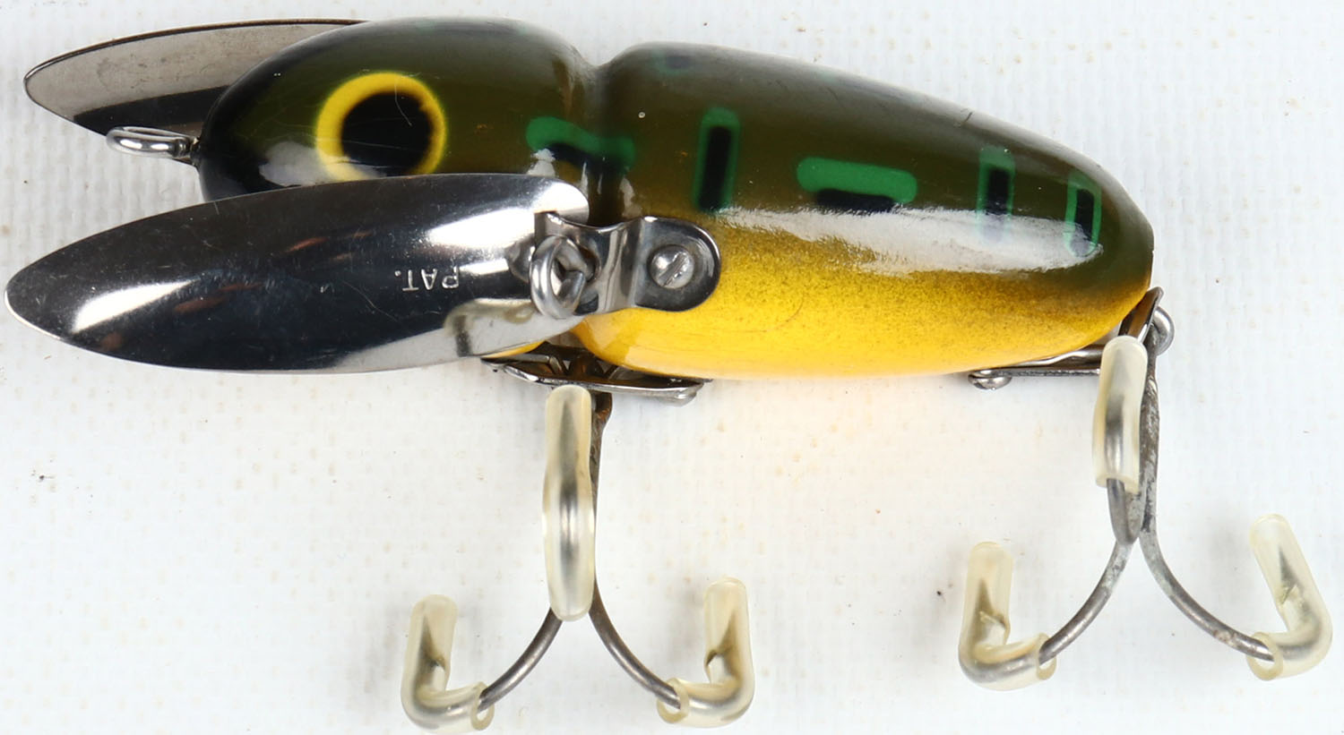 Heddon Crazy Crawler, wood lure, PE, frog pattern, 2 hooks, surface rig. Grade: Excellent ++ - Value: 20 to 75