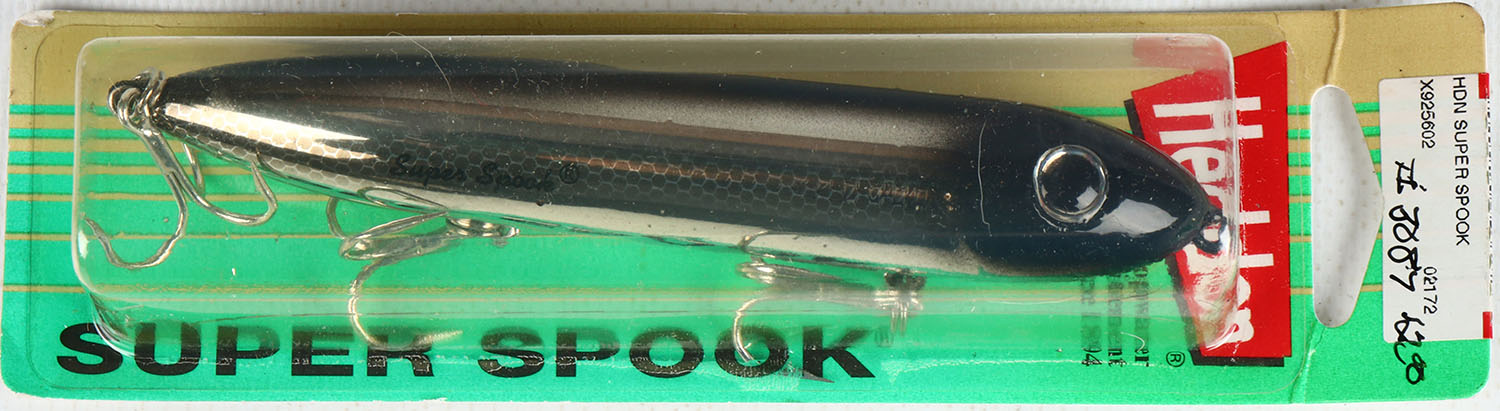 Heddon Super Spook in original package, plastic lure, PE, sliver & black scale, 3 hooks, surface rig. Grade: Excellent ++ - Value: 4 to 50