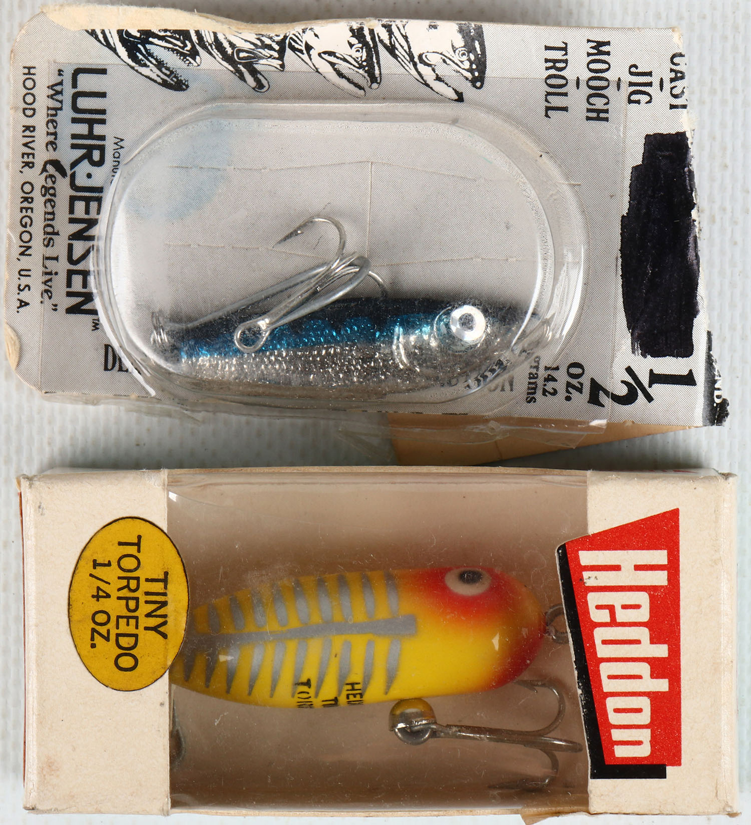 Lot of 2 lures in original packages, plastic lure, Heddon Tiny torpedo, Luhr-Jensen Crippled Herring. Grade: Excellent - Value: 10 to 50